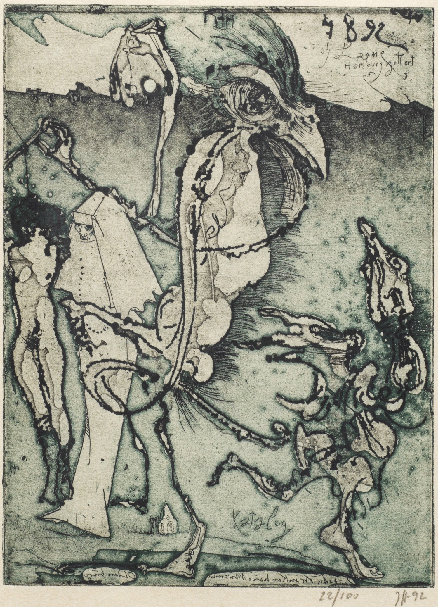 Radierung u. Aquatinta in Grün/Papier, 1992. Sign., dat. (19)92 u. nummeriert 22/100. In der Platte betitelt sowie bez. "Katalog" u. dat. 7.8.(19)92. Blatt aus der Folge "Der Foliant", Kat. Deutsches Krankenhaus-Museum, Oldenburg, 1992. Plattenmaß ca. 23,8 x 18 cm. Rahmen.