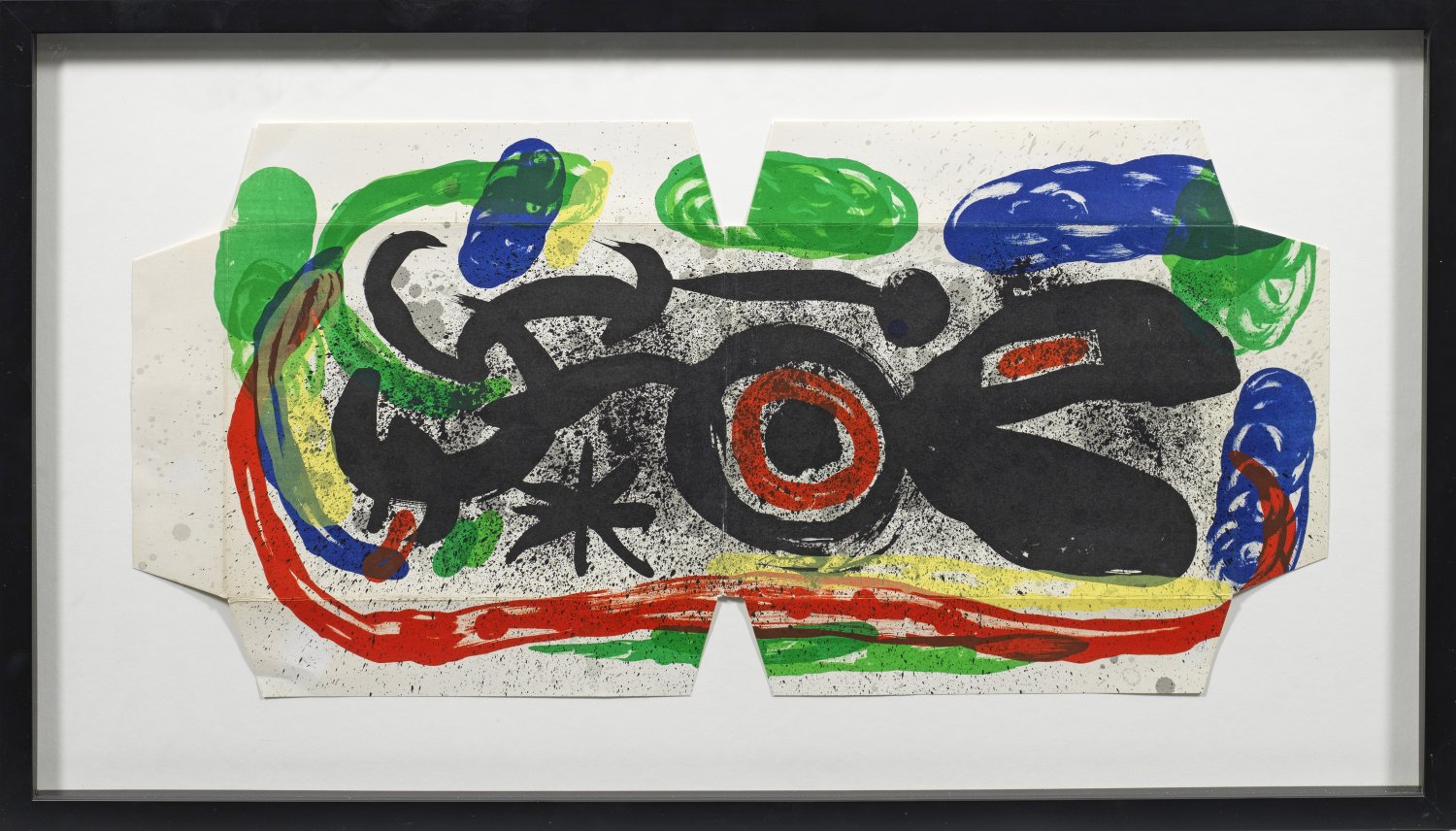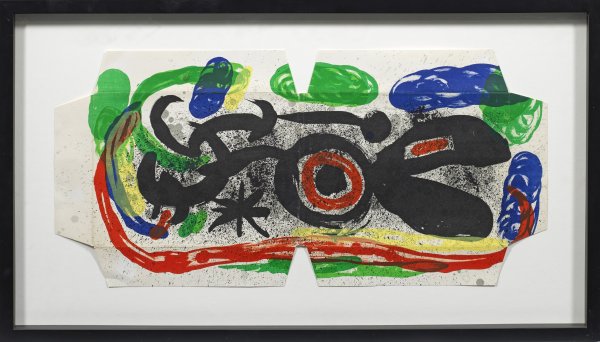 Farblithographie/Papier, 1968. Als Umschlag umgelegte Originallithographie in sieben Farben für den Ausstellungskatalog "Joan Miró. Oeuvre gravé et lithographe", Galerie Gérald Cramer, Genf, 1969. Auflage 1650 Exemplare. Blatt ca. 33,5 cm x 70 cm. Rahmen.