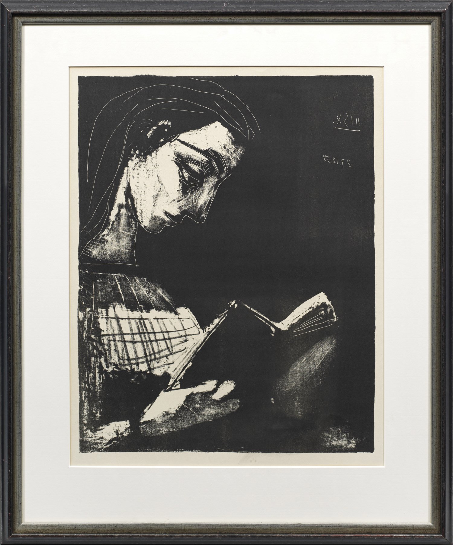 Lithographie/Arches-Velin (mit Wasserzeichen), 1958. R. o. im Druck doppelt dat. "11.1.(19)58" und 27.12. (19)58. Dritter und letzter Zustand. Wvz. Bloch 852; Gauss/Reusse 739; Picasso Project 309 State 3a. Wahrscheinlich einer von sechs, leicht variierenden, satten Abzügen außerhalb der Auflage von 50 nummerierten Exemplaren (Hrsg. Galerie Louise Leiris, Paris). Gedruckt im Atelier Fernand Mourlot, Paris. Voller Blattrand, leicht gebräunt, lichtrandig, die rechte untere Blattecke ger. gestaucht. Darstellung ca. 56 cm x 40,2 cm; Blatt 66 cm x 50 cm. Rahmen.