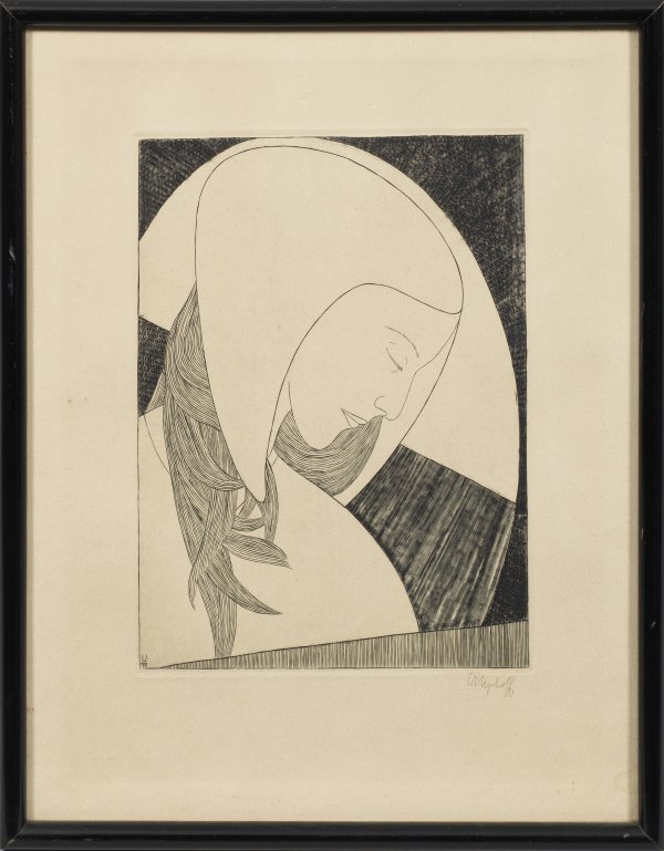 Radierung/Bütten, 1917. Sign.; In der Platte monogr. u. dat. (19)17. Blatt aus der 1921 von ihm in der Werkgemeinschaft Worpswede herausgegebenen Folge von Radierungen "Sechs Köpfe", Auflage 50 unnummerierte Exemplare. Plattenmaß ca. 24 cm x 17,5 cm. Rahmen.