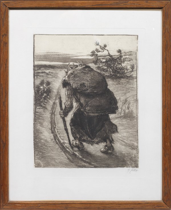 Radierung, Vernis mou und Stoffdruckverfahren/gewalztes China auf Kupferdruckkarton, um 1902. Sign.; Wvz. Rosenbach 31b. Sehr seltenes, bedeutendes Blatt Zilles. Verso auf altem Klebezettettel vom Künstler eigenhändig bez. "4. Graphische Ausstellung des Deutschen Künstlerbundes Chemnitz 1912. Heinrich Zille"; überdies auf einem Ausstellungsetikett des Sächsischen Künstlerverbands vom Künstler eigenhändig bez. "Heinrich Zille", mit Adresse Zilles in Berlin-Charlottenburg u. Betitelung "Frau mit Reisigsack. Radierung", Verkaufspreis M "26./ungerahmt 23". Plattenmaß ca. 41 cm x 33,1 cm; Blatt ca. 53,5 cm x 43,5 cm. Rahmen.