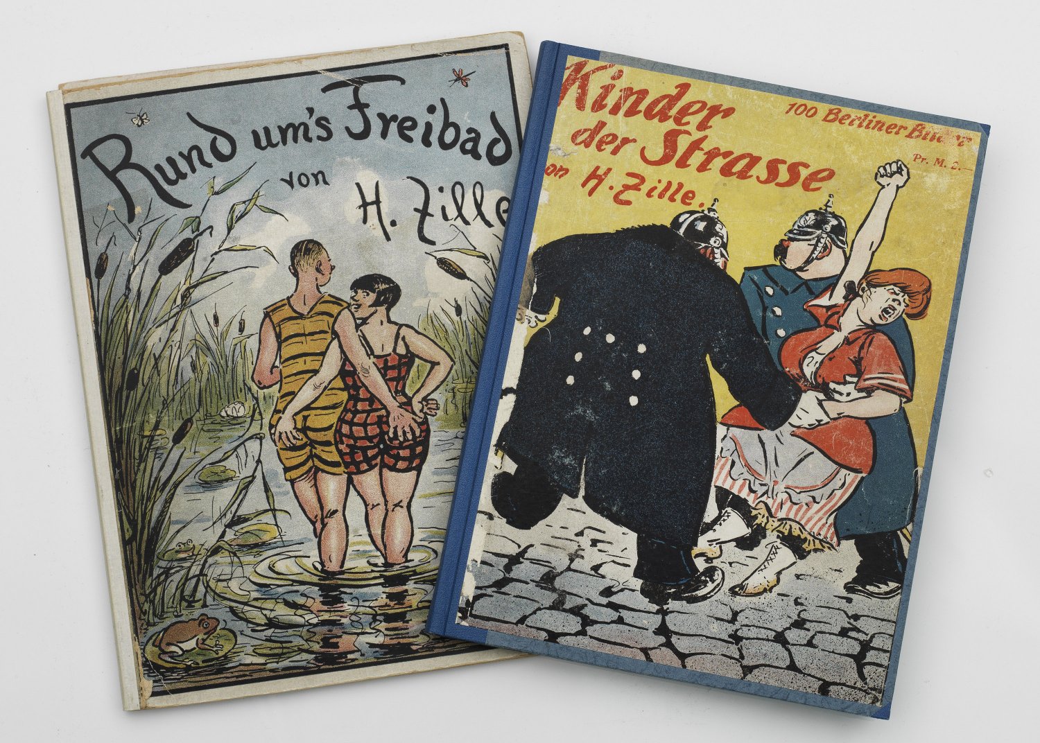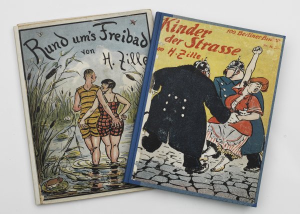 Zwei Bücher. Erstausgabe der "Kinder der Straße", erschienen im Verlag der Lustigen Blätter (Dr. Eysler & Co), Berlin 1908, Besitzerstempel "Eigentum Walter Zille" (Sohn des Künstlers), neu gebunden unter Verwendung der Original-Einband-Vorderseite, im Vorsatz montiertes Autograph von Zille mit Widmung an seinen Sohn Walter, dat. Dezember 1925; "Rund ums Freibad" erschienen im Verlag Dr. Eisler & Co AG, Berlin 1926, 26.-31. Tausend, kartoniert mit Leinenrücken, Einbandrückseite gelöst, darin montiertes Autograph von Zille an Heinrich George "Mein lieber Herr George! Anbei Ihre 2 gewünschten Bücher (...) Grüße Ihr Zille". Ca. 23 cm-24 cm x 17,5 cm-18,5 cm.