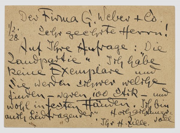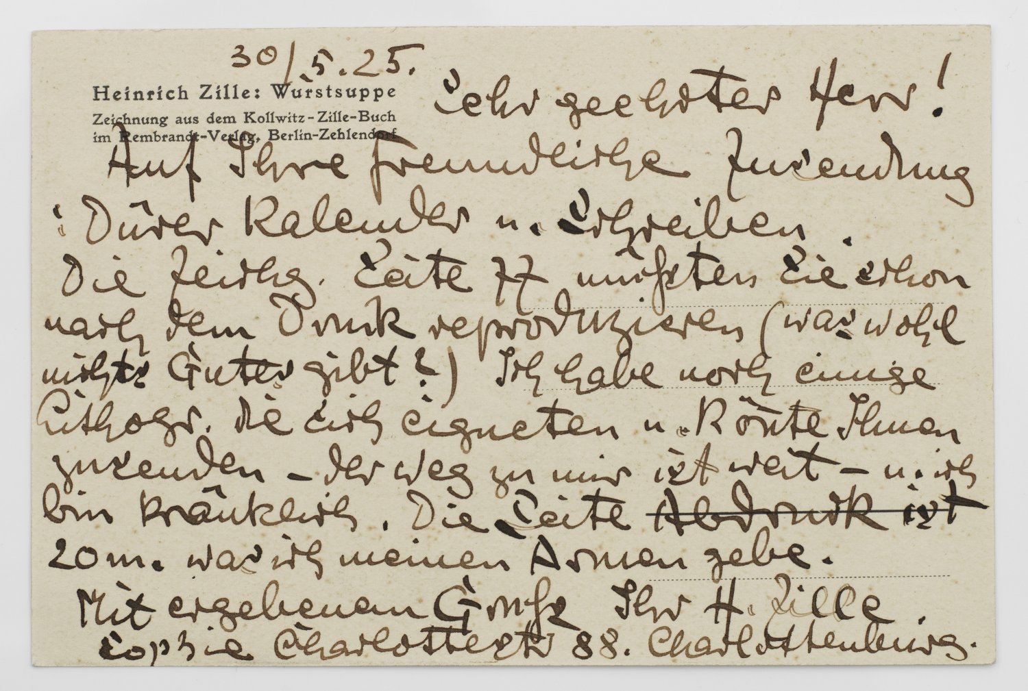 Eine Künstler-Postkarte mit rückseitigem Zille-Motiv ("Wurstsuppe"- "Mutta wächst so ne Wurscht immer wieder?"), verso von Zille eigenhändig beschriftet "Sehr geehrter Herr! (...)" und mit Unterschrift, dat. 30.5(19)25; eine Postkarte Zilles an die Buchhandlung G. Weber & Co., Berlin, betreffend "Die Landpartie", mit eigenhändiger Unterschrift und Adressierung durch Zille, dat. 1.2.(19)28. Ca. 9,6 cm-10,5 cm x 14,3 cm -14,8 cm.