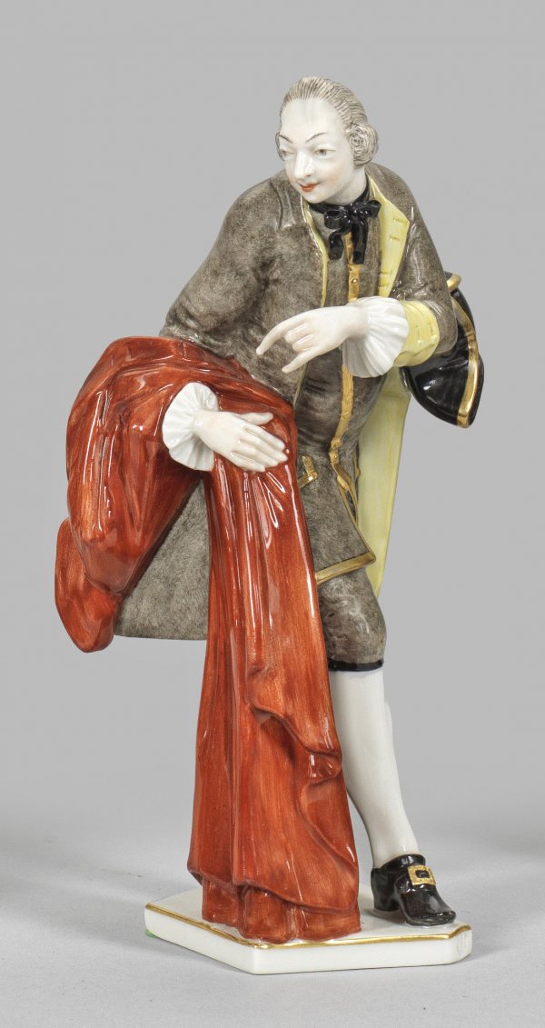 Auf sechseckiger Plinthe stehender Herr in graufarbenem Anzug mit Dreispitz, in der rechten Hand einen roten Mantel haltend. Polychrome Malerei mit Goldkonturierung. Entw. Franz Anton Bustelli. Eingepresste Manufakturmarke. H. 17 cm.