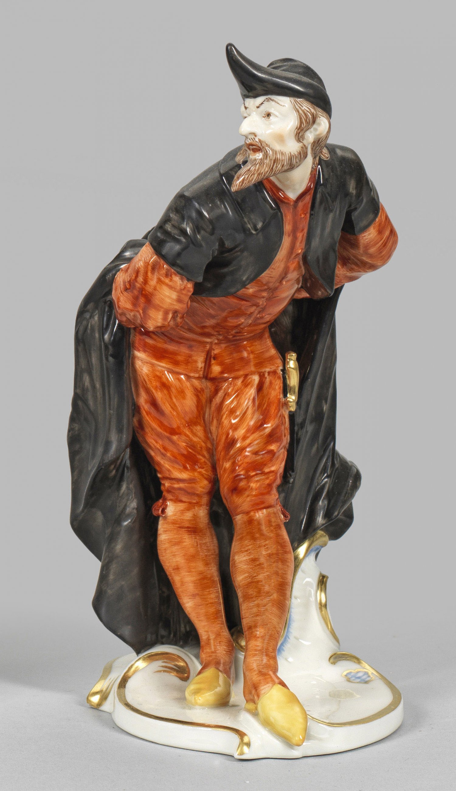 Auf Rocaillesockel stehender Pantalone in rotem Kostüm mit schwarzem Mantelumhang. Polychrome Malerei mit Goldstaffage. Entw. Franz Anton Bustelli, 1759/60. Manufakturmarke. H. 18 cm.