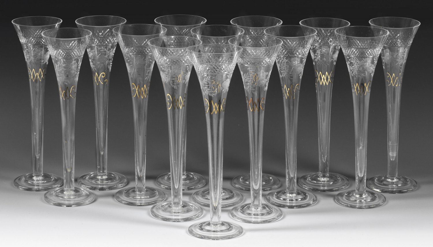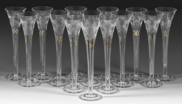 Fourteen French cut and engraved crystal glass champagne flutes with golden monogram. Minor chips to the rims of two flutes.