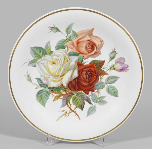 Runde, flach gemuldete Form. Im Spiegel großes, farbenprächtiges Rosenarrangement aus gelben, roten und roséfarbenen, geöffneten Blüten in polychromer Malerei. Goldrand. Schwertermarke. D. 35,5 cm.