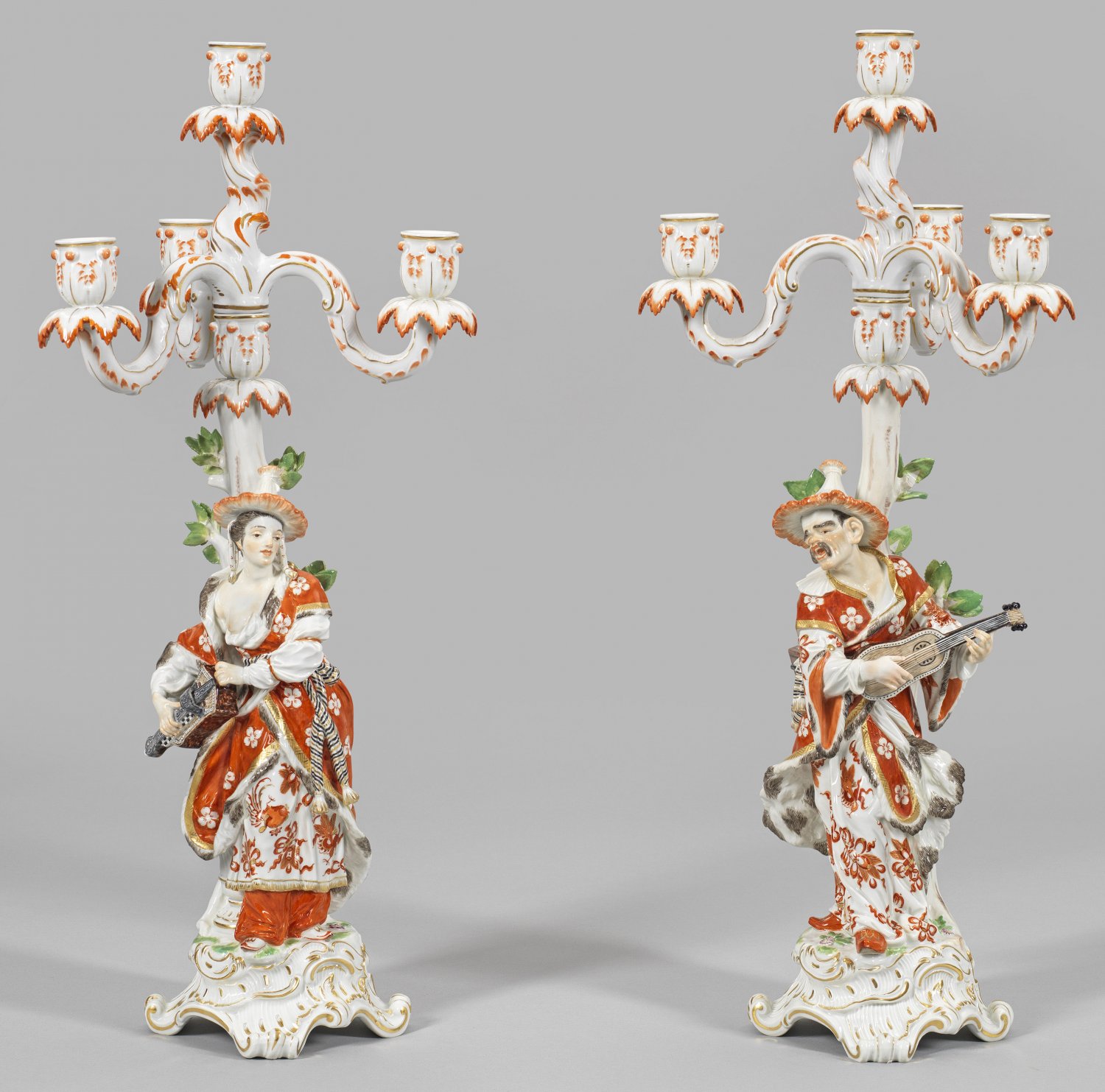 Gegenstücke. 1- bzw. 4-flg.; Auf gehöhtem, stark reliefiertem Rocaillesockel stehende, musizierende Malabarin mit Drehleier, gekleidet in langem Gewand mit Dekor "Roter Drache" und einem pelzgefütterten, eisenrot staffierten Mantel mit Blütenmuster und goldradiertem Saum. Das dunkle Haar ist von einem spitzen Strohhut bedeckt. Rückseitig aufsteigender Schaft in Form eines Laubbaumes, in vasenartige Tülle mit blattförmigem Wachsfänger übergehend. Korrespondierender, abnehmbarer Leuchteraufsatz mit geschwungenen, blattreliefierten Leuchterarmen und vier Tüllen. Das Gegenstück mit der Figur eines singenden, die Gitarre spielenden Malabaren. Äußerst feine eisenrote Camaieu- und polychrome Malerei mit reichem, teilw. radiertem Golddekor und -staffage. Entw. Friedrich Elias Meyer. Modell-Nr. 1519 und 1523. Rest.; Jahreszeichen. Schwertermarke. Ges.-H. 62 cm.