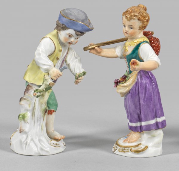 Auf rocaillereliefiertem Sockel stehendes Mädchen mit geschultertem Bündel, die Schürze mit Früchten gefüllt. Als Pendant ein sich nach vorn beugender Gärtnerjunge mit Sichelmesser. Feine, polychrome Malerei mit Goldstaffage. Entw. Johann Joachim Kaendler. Modell-Nr. 25 und 25x. Teilw. besch.; Rest.; Schwertermarke. H. 12 cm - 12,5 cm.