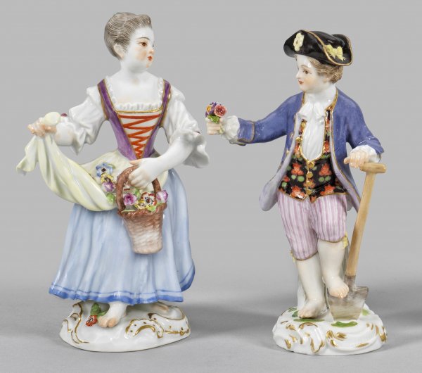 Auf rocaillereliefiertem Sockel stehendes Mädchen mit blütengefüllter Schürze und Blumenkorb. Als Pendant ein Gärtnerjunge mit Spaten und Blumenstrauß. Feine polychrome Malerei mit Goldstaffage. Entw. Johann Joachim Kaendler. Modell-Nr. 2 und 2x. Teilw. rest.; Schwertermarke. H. 13 cm - 13,5 cm.
