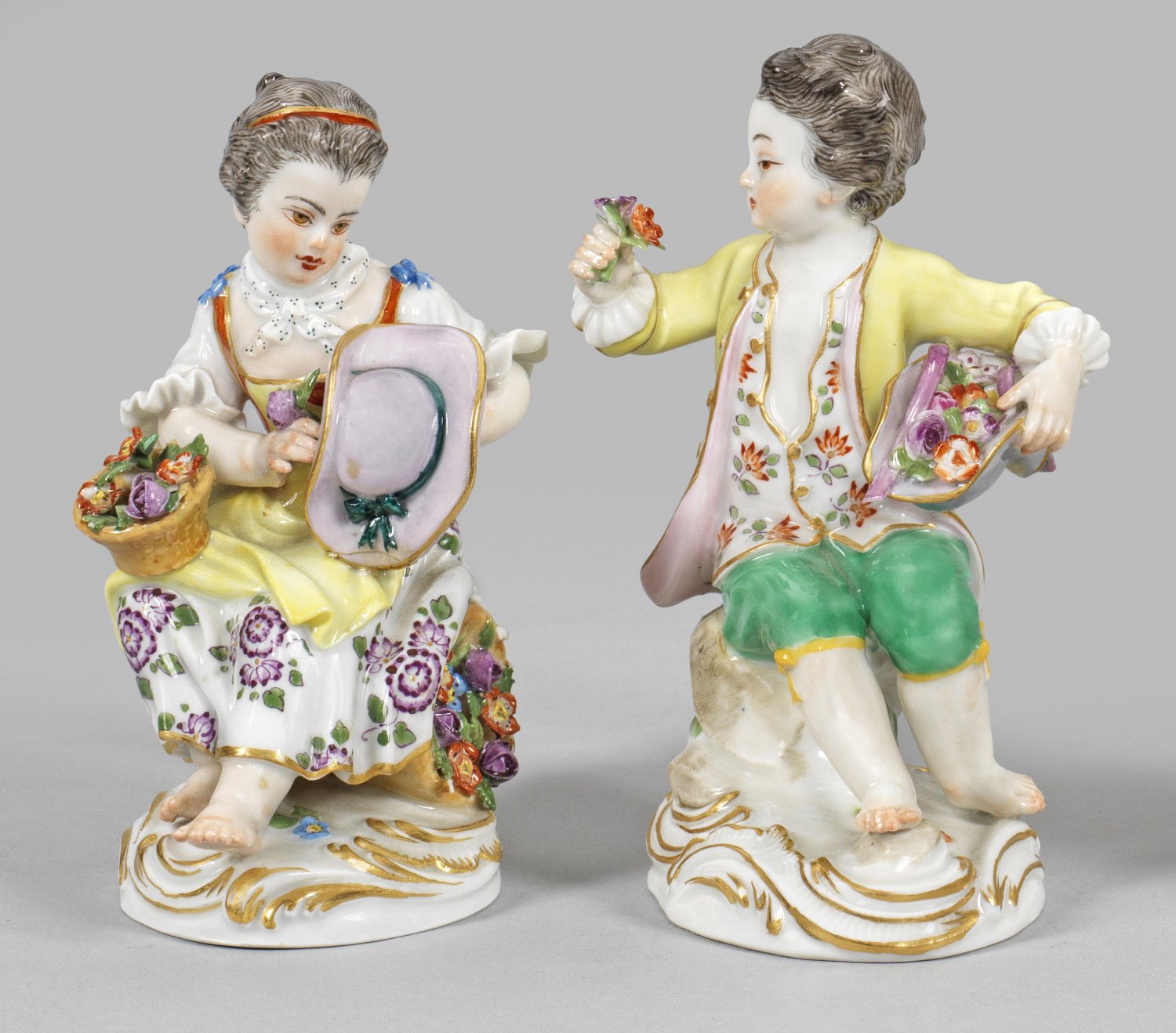 Rocaillereliefierter Sockel. Auf einem längsliegenden, blütengefüllten Korb sitzendes Mädchen, in der linken Hand einen Hut haltend. Als Pendant ein auf einem Fels sitzender Knabe, unter dem linken Arm einen Hut mit Blumen tragend. Feine polychrome Malerei mit Goldstaffage. Entw. Johann Joachim Kaendler. Modell-Nr. 17 und 17x. Unw. best.; Teilw. minim. rep.; Schwertermarke. H. 11,5 cm - 12,5 cm.