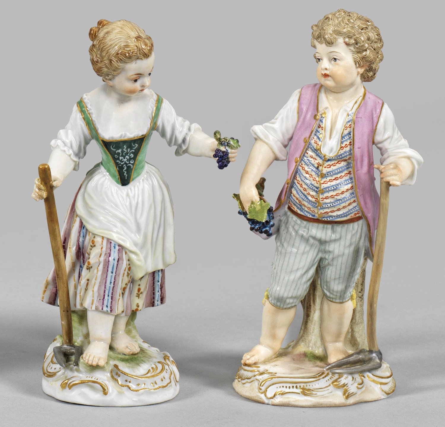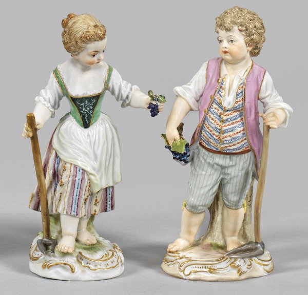 Auf rocaillereliefiertem Sockel stehendes Mädchen bzw. Gärtnerjunge, in den Händen Trauben bzw. eine Gartenhacke haltend. Feine polychrome Malerei mit Goldstaffage. Entw. Johann Joachim Kaendler. Modell-Nr. 13 und 13x. Minim. best./rest.; Schwertermarke. H. 13 cm - 13,5 cm.