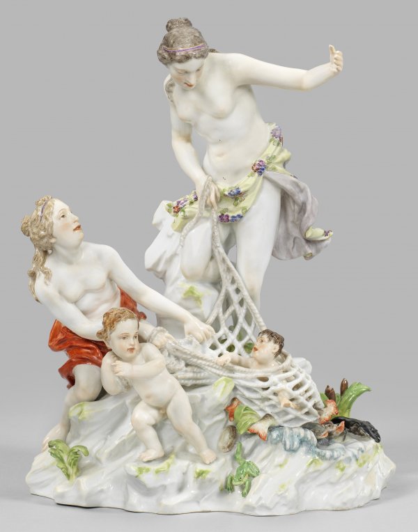 Auf naturalistisch gestaltetem, mit Schilf, Muscheln und Meerestieren belegtem Felssockel komponierte Gruppe von zwei mit locker drapiertem Lendentuch bekleideten Nereiden, unter Mithilfe eines Puttos ein im Netz verfangenes Tritonenkind aus dem Wasser ziehend. Polychrome Malerei mit wenig Gold. Entw. Johann Joachim Kaendler, wohl Carl Christoph Punct und Johann Carl Schönheit, 1769. Rest.; Schwertermarke. H. 31 cm.