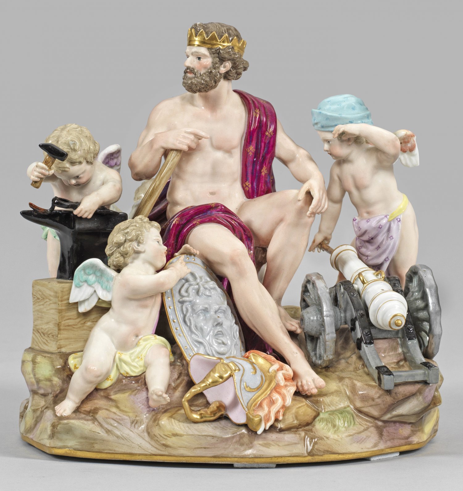aus der Serie "Vier Elemente". Auf unregelmäßigem Felssockel erhöht sitzender Vulkanus mit Goldkrone, sich auf einen Hammer stützend. Umgeben von drei Putten beim Schmieden von Eisen, Stopfen des Kanonenrohres bzw. Präsentieren eines Medusenhaupt-Schildes. Zu seinen Füßen liegender, antikisierender Helm mit Helmbusch. Rückseitig ein weiterer sitzender Putto. Polychrome Malerei mit reicher Goldstaffage. Entw. Michel Victor Acier, 1777. Modell D 80. Minim. rest./rep.; Schwertermarke. 23 cm.