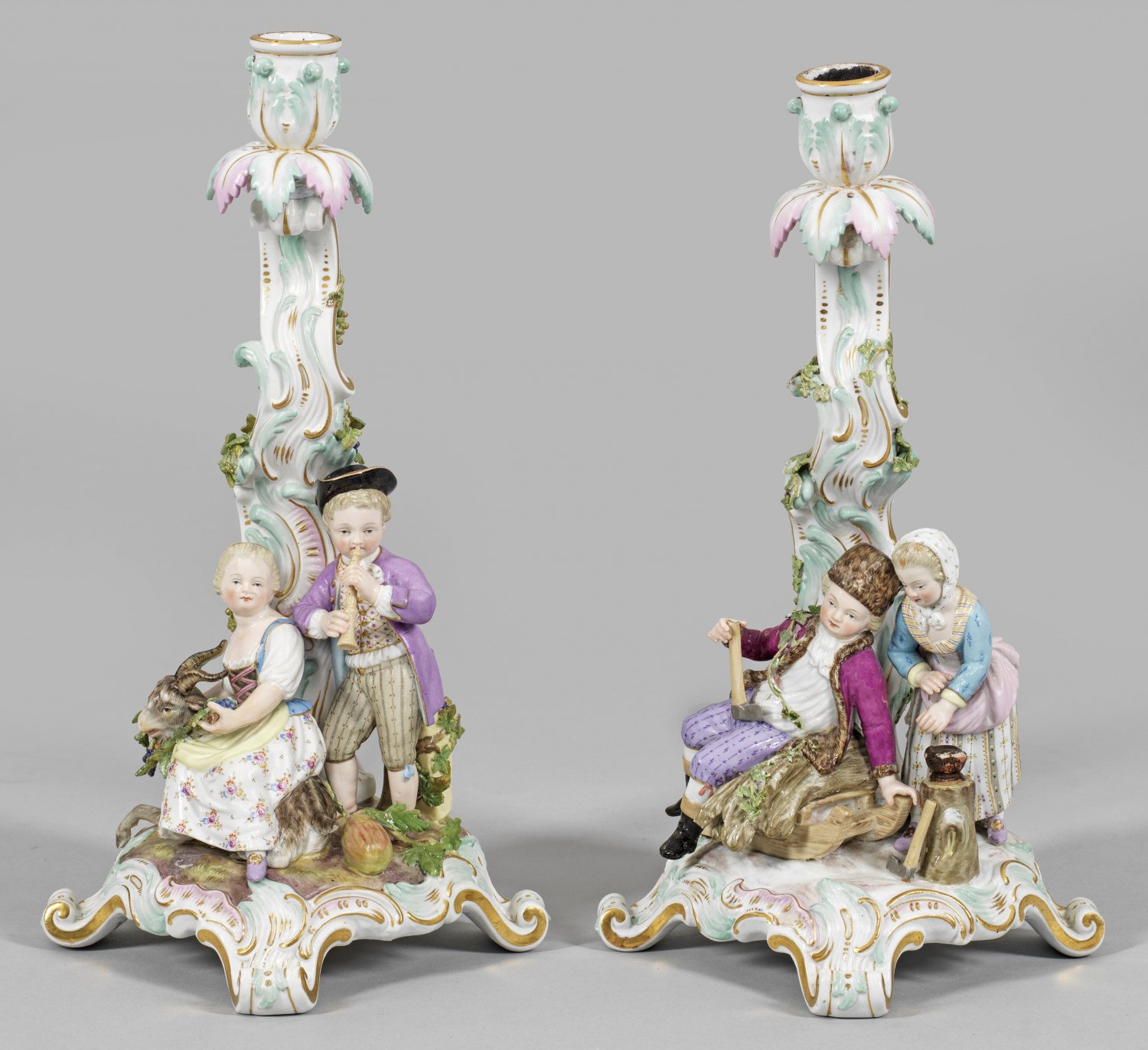 aus der Serie der "Vier Jahreszeiten". 1-flg.; Naturalistisch staffierter Rocaillesockel mit volutenförmig aufsteigendem, von aufgelegten Wein- und Efeuranken umzogenem Schaft, übergehend in vasenartige Tülle über blattförmigem Wachsfänger. Schauseitiges Kinderpaar mit Attributen des Herbstes und Winters. Polychrome Malerei mit Goldstaffage. Feine zartrosa und seegrüne Staffierung. Modell-Nr. 785 und 786. Best.; Rest.; Schwertermarke. H. 31 cm - 32 cm.