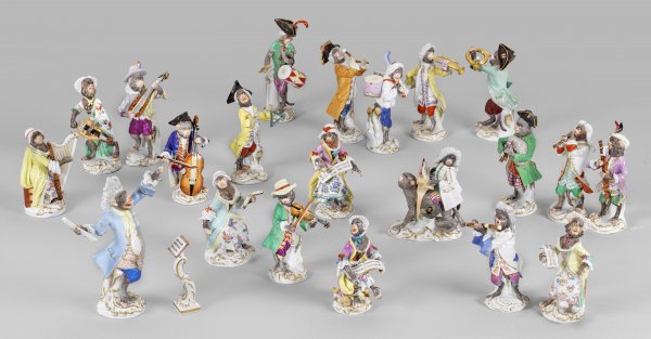 A complete 22-piece collection of porcelain figures from the "monkey orchestra" modelled by J. J. Kaendler and P. Reinicke. Timpani beater after 2000. Partly minor chipped/restored. Crossed swords mark.