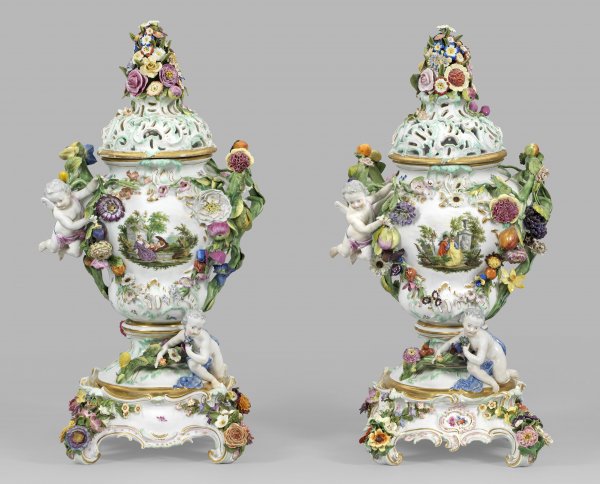 auf quadratischem, von eingerollten Volutenfüßen getragenem Sockel. Über getrepptem, rocaillereliefiertem Rundfuß balusterförmiger, stark vorwölbender Vasenkorpus mit gerundeter Schulter und profiliertem Rand. Gehöhter, durchbrochen gearbeiteter Deckel, bekrönt von feinplastischem Blumenarrangement. Seitlich stark reliefplastisch aufsteigende Ranken als Handhaben. Feinplastisch modellierter, aufgelegter Dekor mit üppigen Festonen aus sommerlichen Blüten und Früchten. Unterhalb sitzende bzw. oberhalb schwebende Amorette mit Blumen. Beidseitig der Wandung, zwischen farbigem Streublumendekor angelegte, großflächige, szenische Darstellung von Watteaufiguren in Parklandschaft. Feine polychrome Malerei mit reicher Goldstaffage. Entw. Johann Joachim Kaendler. Minim. best.; Rest.; Schwertermarke. Ges.-H. ca. 67 cm. Vasen-H. 56 cm.