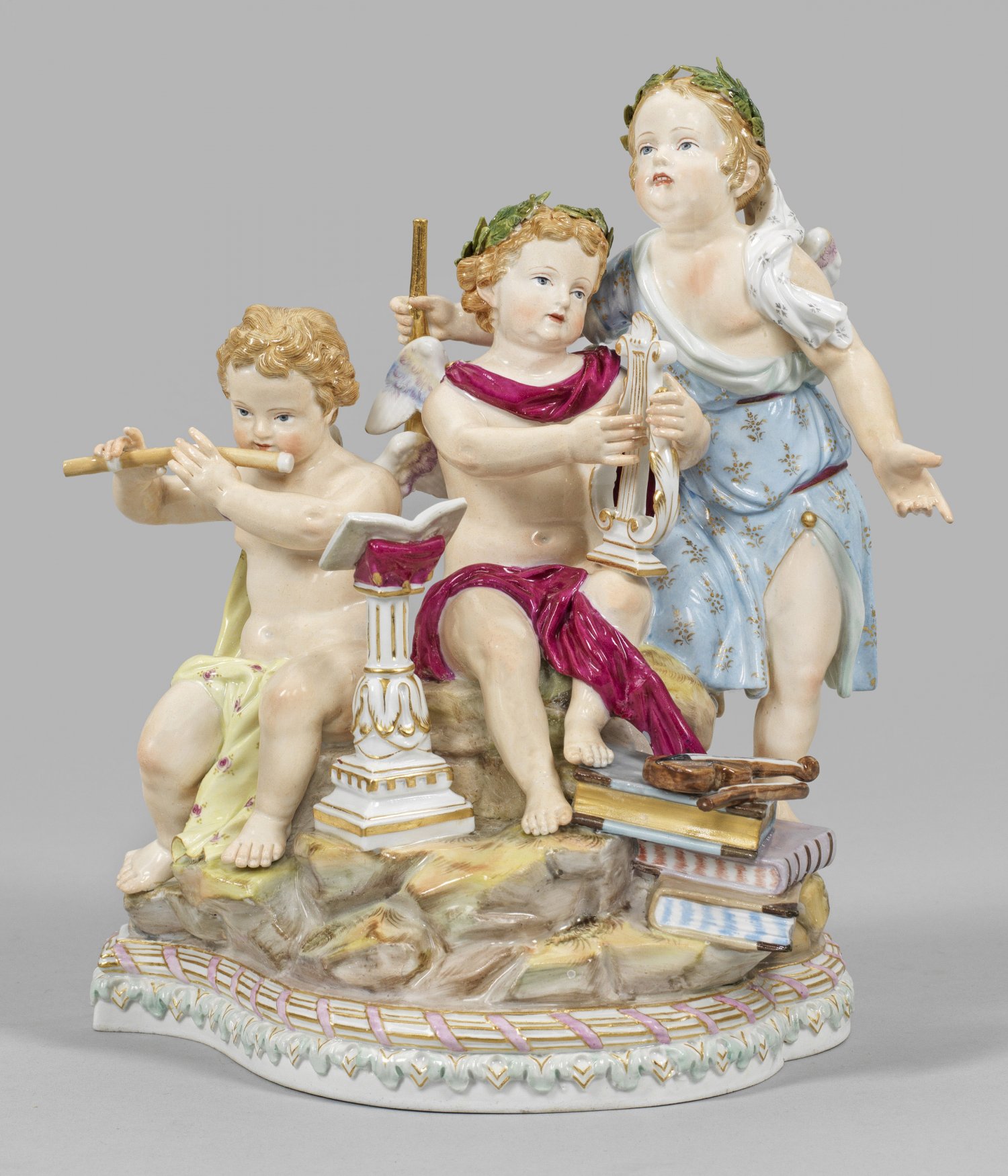 Passig geschweifter Sockel mit reliefierten Ornamentbordüren. Über felsigem Terrain komponierte Puttengruppe aus drei musizierenden Amoretten in farbigen, teilw. blumig gemusterten Gewändern mit Querflöte, Lyra und Trompete. Zu ihren Füßen liegender Stapel mit Büchern und Violine sowie stehendes Pult mit Noten. Polychrome Malerei mit Goldkonturierung. Entw. Michel Victor Acier, um 1774/75. Modell-Nr. 10. Minim. best.; Unw. rest.; Schwertermarke. H. 22 cm. 20 cm x 12 cm.