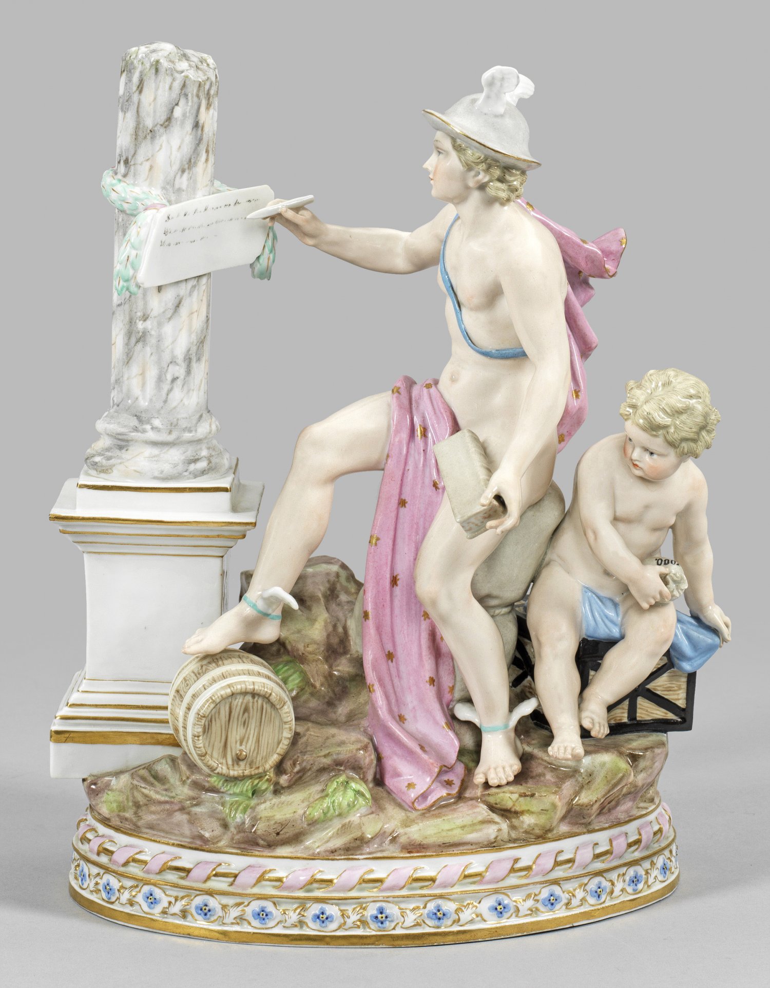 Ovaler Felssockel mit reliefierten Ornamentbordüren. Auf einem geschnürten Ballen sitzender Götterbote Merkur mit geflügelten Füßen, Flügelhut und rosafarbenem, von Goldsternen gemustertem Tuch, den rechten Fuß auf ein Fass aufstellend. Die linke Hand ein Buch haltend. Mit der Rechten schreibt er auf eine Tafel, die mit einem Lorbeerkranz an einem marmoriertem Säulenstumpf über profiliertem Podest befestigt ist. Begleitend ein auf einer Kriegskasse sitzender Putto mit Talerbeutel. Polychrome Malerei mit reicher Goldstaffage. Entw. Michel Victor Acier. Minim. best.; Schwertermarke. H. 27 cm.