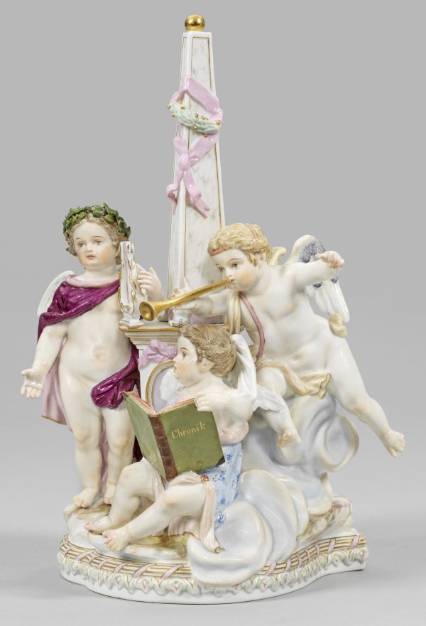 Passig geschweifter Sockel mit reliefierten Ornamentbordüren. Über felsigem Terrain komponierte Puttengruppe aus drei verkleideten Amoretten mit Lorbeerkranz und Lyra als Apoll, einem geöffneten, als Chronik betitelten Buch und Feder als Geschichtsschreiber sowie mit Posaune als Fama, Personifikation des Ruhmes und des Gerüchts. Zwischen ihnen ein mit Schleifen und Lorbeerkranz behangener, marmorierter Obelisk über Podestsockel mit Reliefporträt Zarin Katharina II. von Russland. Polychrome Malerei mit Goldstaffage. Entw. Michel Victor Acier, um 1774. Modell-Nr. 11. Unw. rest.; Schwertermarke. H. 30,5 cm. 21 cm x 12 cm.