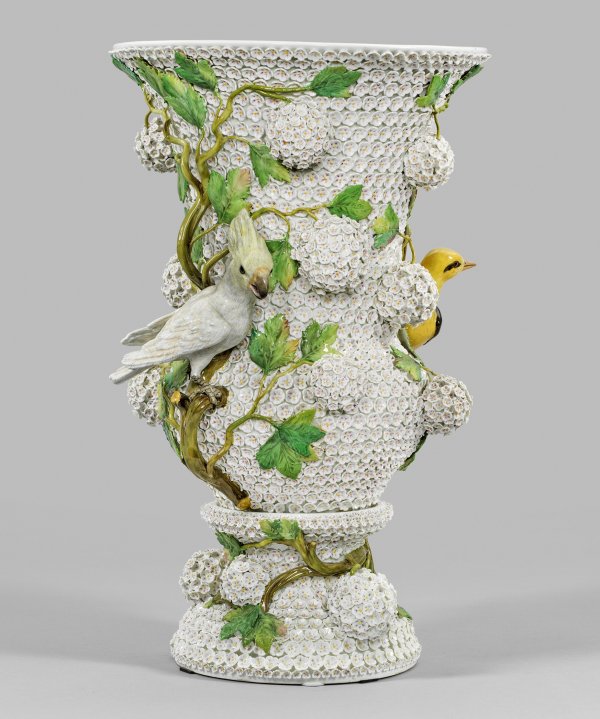 Über hochgezogenem Rundfuß gebauchter Korpus, in abgesetzten, sich trichterförmig erweiternden Hals übergehend. Auf der Wandung flächendeckender Fond aus plastisch aufgelegten, dezent in Purpur und Gelb staffierten Blüten, umzogen von kräftigen Blattranken mit zahlreichen Blütendolden, sog. Schneeballenkugeln. Seitlich, auf den Dolden sitzender großer Pirol bzw. Gelbhaubenkakadu. Polychrome Malerei. Entw. Johann Joachim Kaendler. Minim. rest./besch.; Schwertermarke. H. 51 cm.