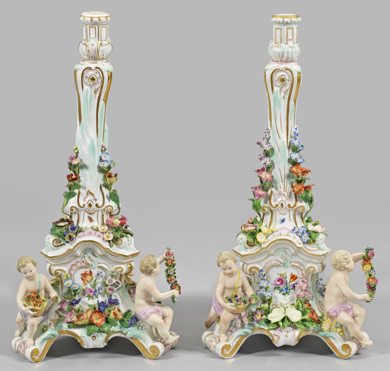 A pair of porcelain candlesticks with cupids as allegories of the seasons spring, summer and autumn. Insignificantly restored. Partly crossed swords mark.