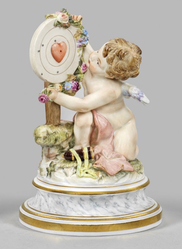 Auf profiliertem, marmoriertem Rundsockel kniender, siegreicher Amor, eine Zielscheibe mit Herz mit einer Blumengirlande schmückend. Polychrome Malerei mit Goldstaffage. Entw. Heinrich Schwabe. Modell-Nr. L 123. Schwertermarke. H. 15,5 cm.