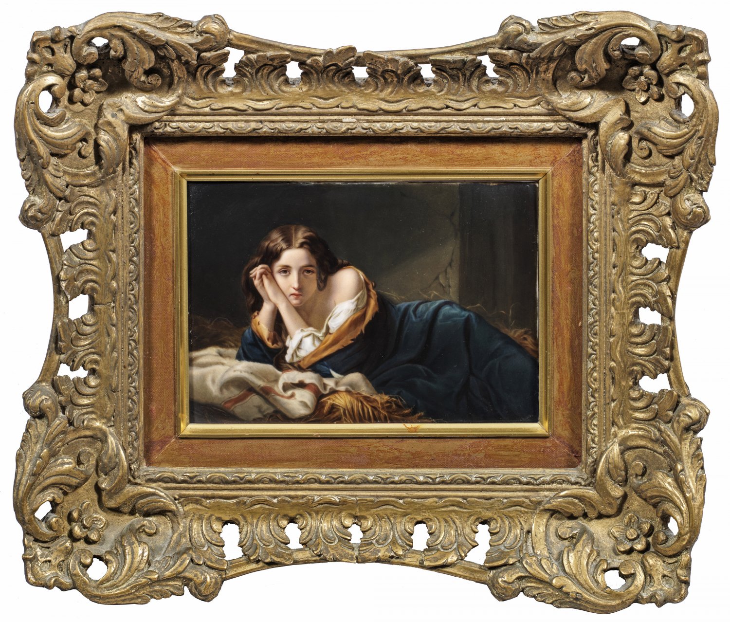 A finely painted porcelain plaque depicting a young female lying on a straw bed, probably after F. Hayez or Ch. F. Jalabert. Impressed sceptre and KPM mark. In stuccoed and gilded frame.