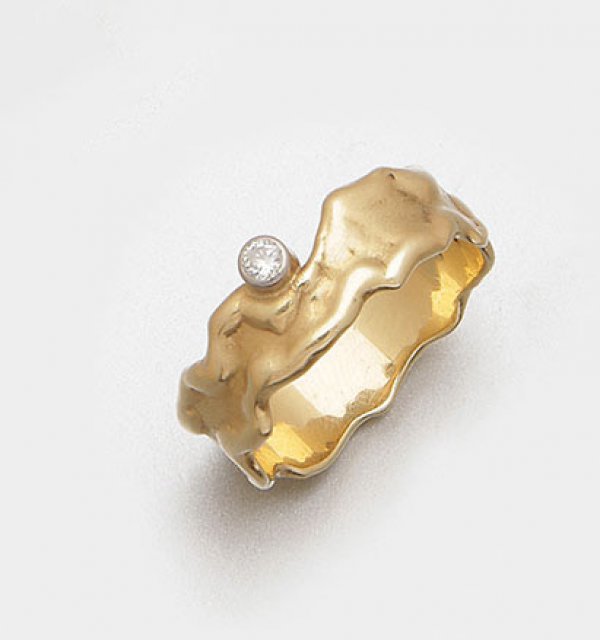 Gelbgold, gest. 585. Passig geschweifte Bandform, besetzt mit einem Brillanten von ca. 0,05 ct.; Gew. ca. 4,85 g.