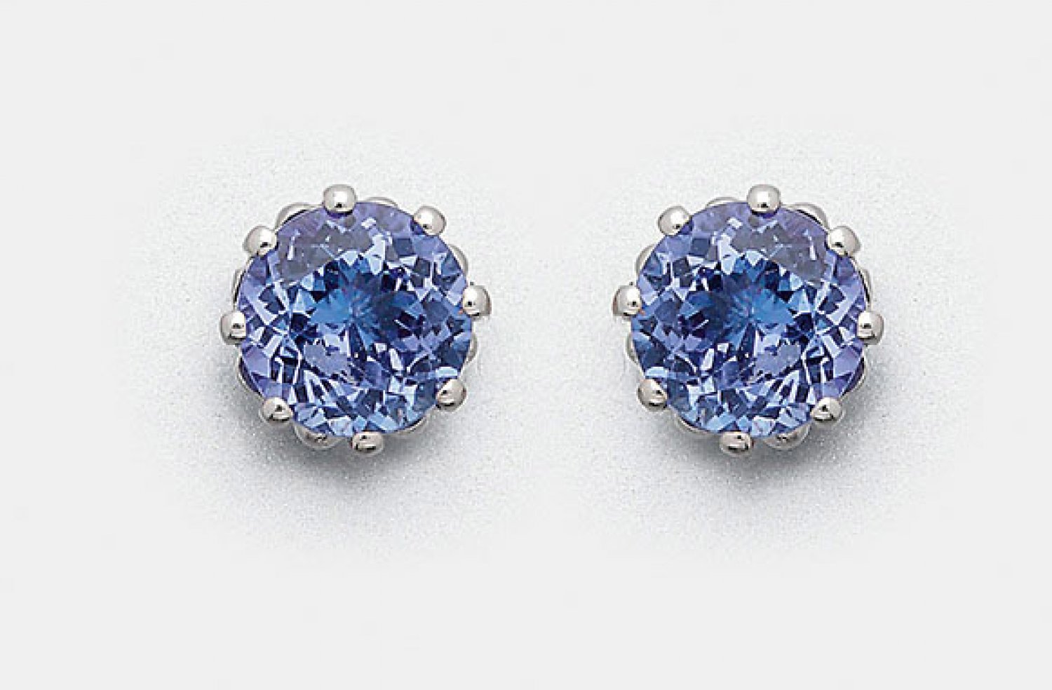 Weißgold, gest. 750. Zentral besetzt mit zwei violettblauen Tansaniten von 2,53 ct. und 2,56 ct. in eleganter Kronenfassung. Ges.-Gew. ca. 4,12 g.