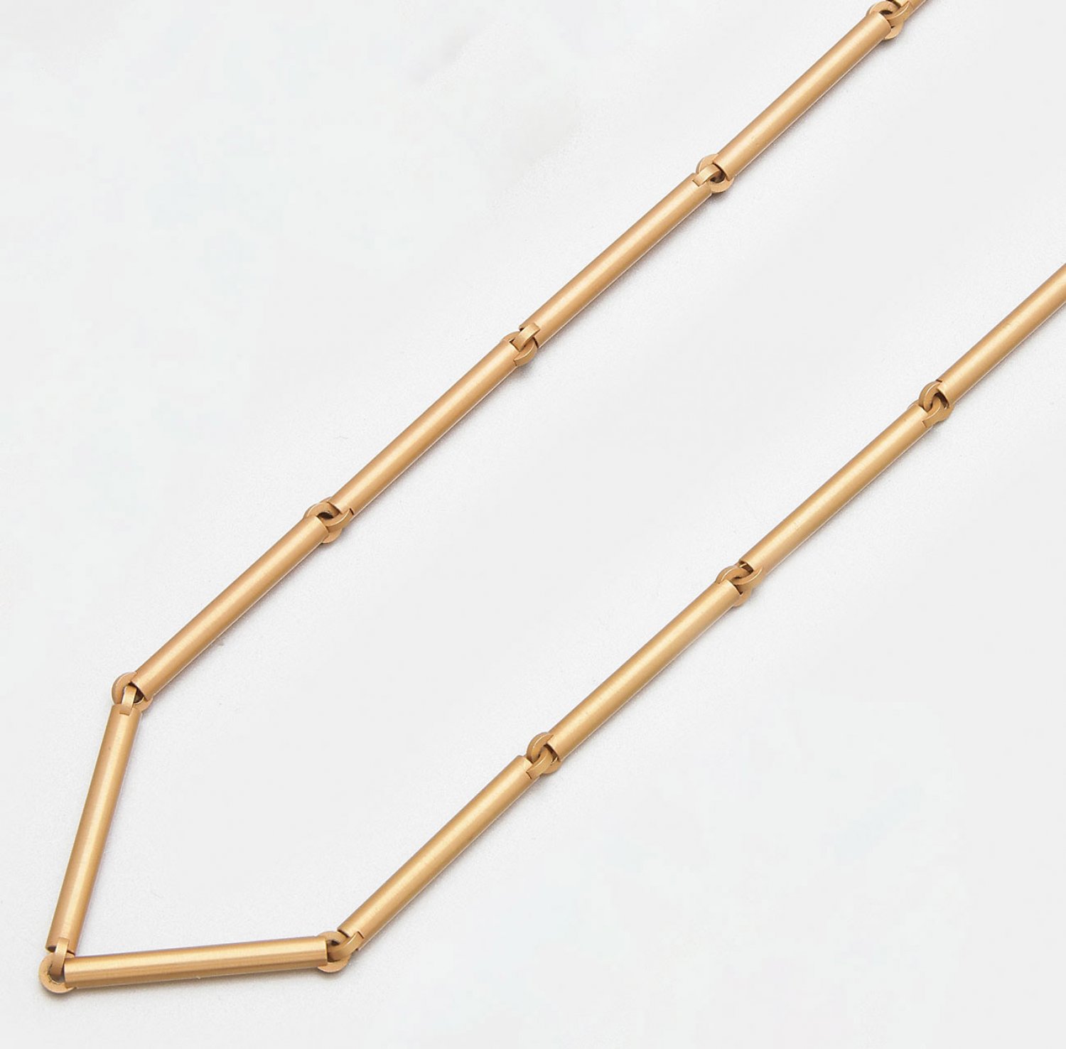 Gelbgold, gest. 750. Einreihige Kette aus stabförmigen, satinierten Gliedern, verbunden durch kreisförmige Ösen. Sehr feine Goldschmiedeausführung. Herstellerzeichen. Gew. ca. 24,59 g.