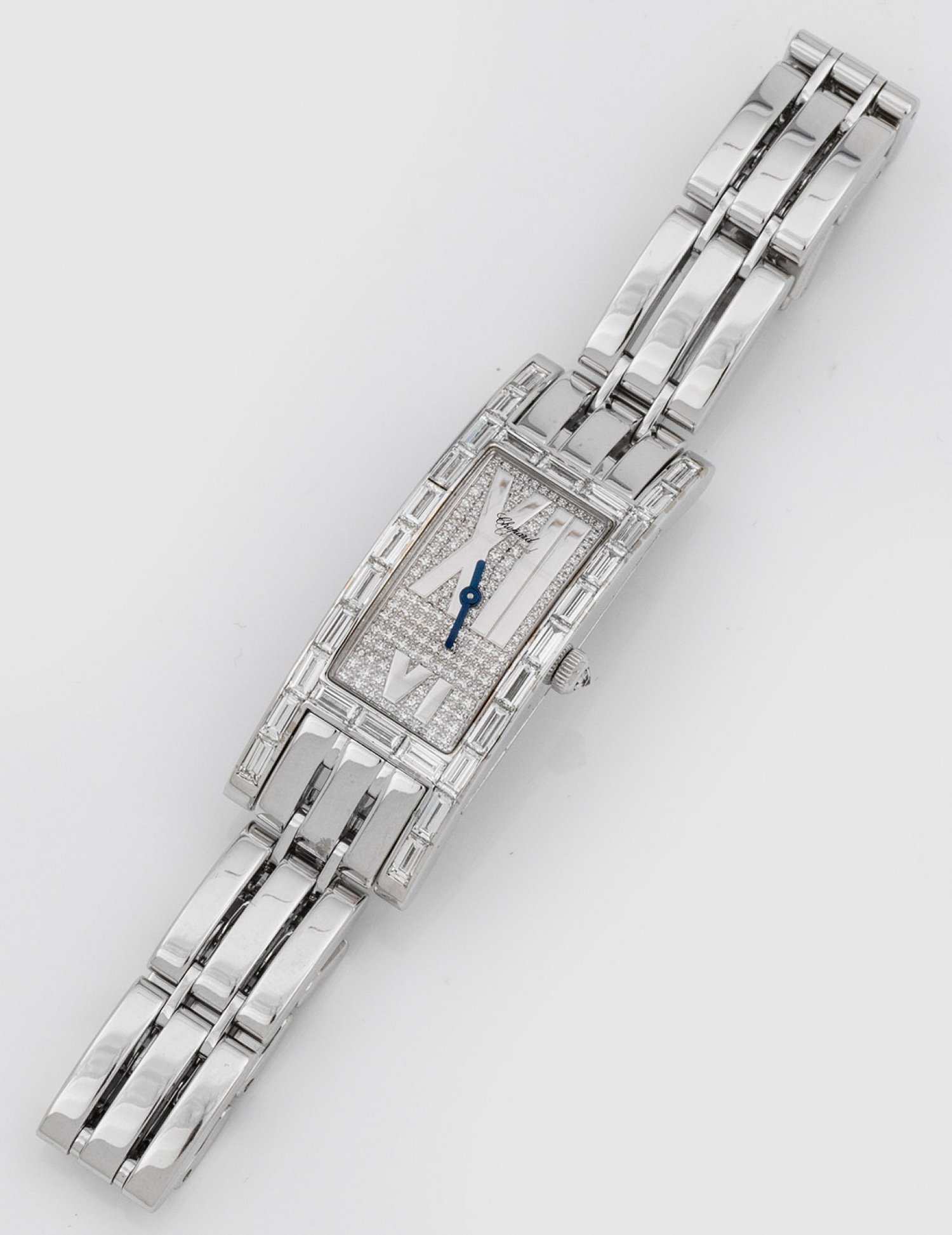 Weißgold, gest. 750. Rechteckiges, leicht bombiertes Uhrengehäuse besetzt mit Diamantbaguetten von zus. ca. 3,38 ct. (F-G/vvs), ein Diamant im Briolettschliff von ca. 0,07 ct. (F-G/vvs), Zifferblatt ausgefasst mit Brillanten von zus. ca. 0,38 ct. (F-G/vvs) , Ziffern römisch XII. und VI.; Durchbrochenes Gliederarmband mit doppelter Faltschließe. Saphirglas. Quarzwerk. Ref.-Nr. 137217-1002, Serien-Nr. 575744. Neuwertiger Zustand.
