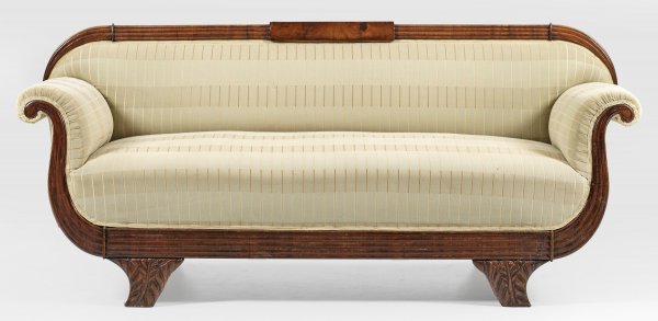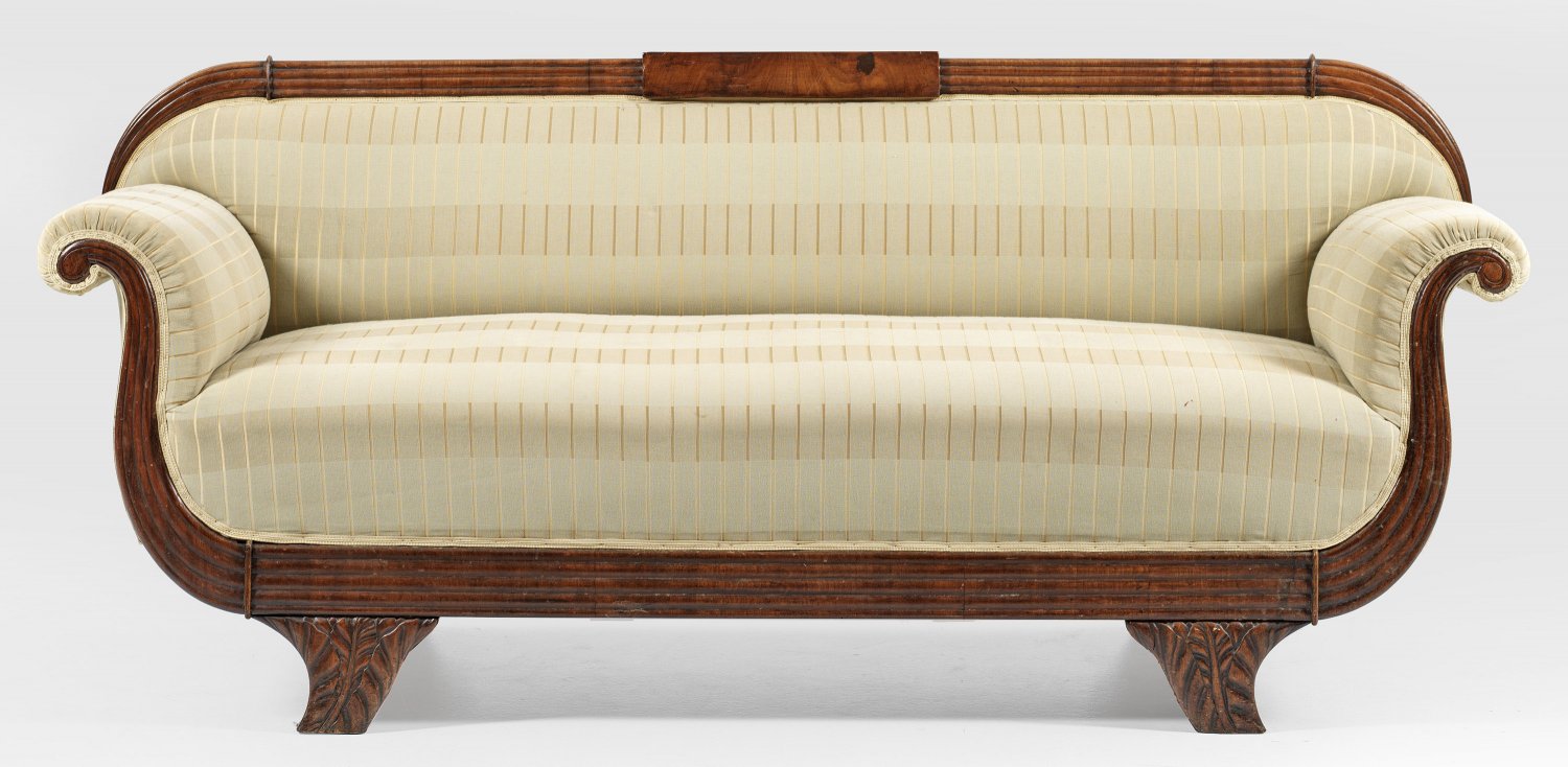 Mahagoni, furniert. Gerade, profilierte Zarge auf blattreliefierten Füßen, in geschwungene Armlehnen übergehend. Korrespondierende, flach gewölbte Rückenlehnenrahmung. Gepolstert und schauseitig bezogen. H. 84 cm. 202 cm x 70 cm. Sitz-H. 45 cm.