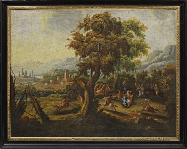 Blick auf eine fantasiereiche, südliche, baumbestandene Landschaft mit einem Gefecht zwischen österreichisch-ungarischen Reitern und Türken. Das Gemälde spiegelt den Einfluss niederländisch-flämischer Schlachtenmaler wie Jan van Huchtenburgh und Karel Breydel wider, welche die Kunst des Barock mit diesem Themenkreis nachhaltig prägten. Öl/Lwd.; Verso Inventaretikett "Schloss Salem (/) Raum No. 63 (/) O. No. 6" aus dem 19. Jh.; 94 cm x 124 cm. Rahmen.