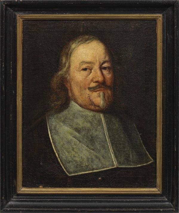 Repräsentatives, ausdrucksvoll charakterisierendes Brustbildnis in der Tracht der Zeit mit breitem, weißem Kragen über dunkler Kleidung, den Kopf leicht ins Profil gewendet. Öl/Lwd.; Verso altes Sammlungs-Etikett des 17./18. Jhs. mit Bez. "(...) Sandrat". Restaurierungsbedürftig. 54 cm x 43,5 cm. Original-Rahmen.