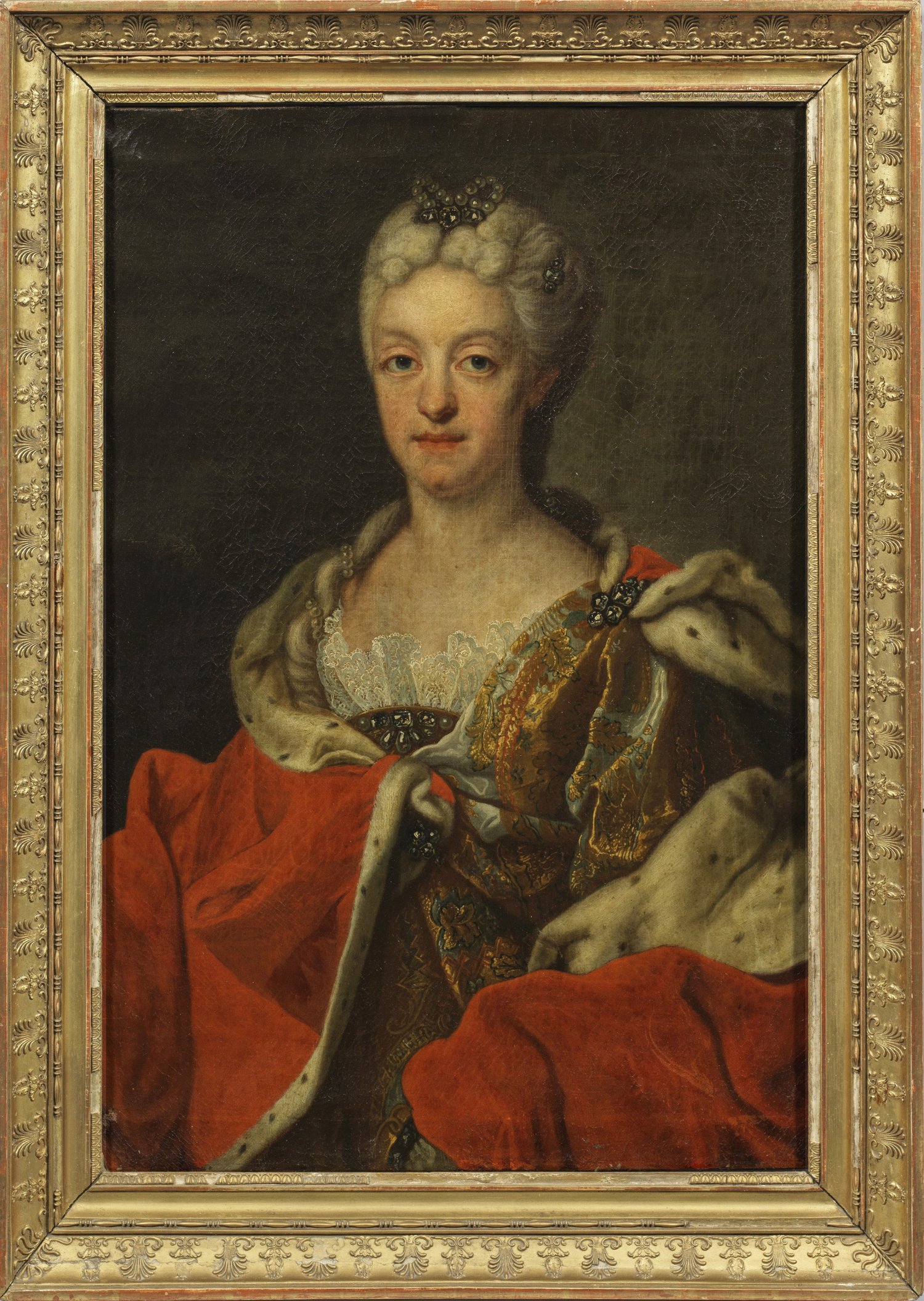 Maria Amalia von Österreich, Tochter des Kaisers Joseph I. (HRR) und Wilhelmine Amalie von Braunschweig Lüneburg, heiratete 1722 den bayerischen Kurfürsten Karl Albrecht, der 1742 als Karl VII. Kaiser des Heiligen Römischen Reichs Deutscher Nation wurde. Durch diese Heirat wurde sie zur Bayerischen Kurfürstin. Der französische Porträtist Vivien arbeitet nachweislich an den Höfen der Wittelsbacher, zu denen Maria Amalia seit ihrer Heirat mit dem Bayerischen Kurfürsten Karl Albrecht gehörte. So fertigte er für die Amalienburg, benannt nach Maria Amalia, eine der bedeutendsten architektonischen Schöpfungen des bayerischen Rokoko, Porträts der Bayerischen Kurfürstenfamilie an. Öl/Lwd.; 81,5 cm x 65 cm. Rahmen.
