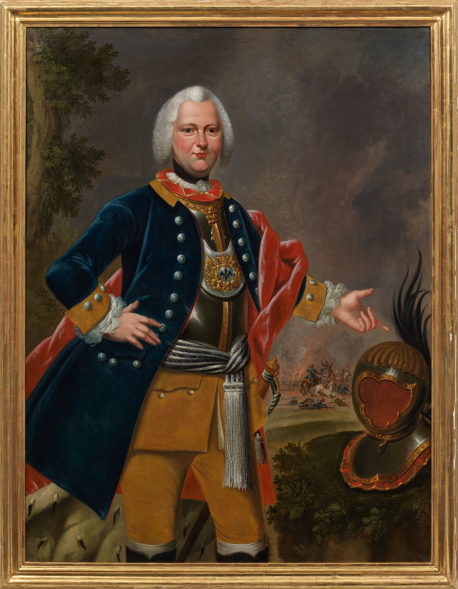 Repräsentatives, historisch bedeutendes Porträt Albrechts als Kniestück mit Darstellung des Prinzen nach halbrechts im Kürass mit Ringkragen und Uniformrock des preußischen Infanterie- bzw. Füsilier-Regiments 39 sowie Hermelinumhang, zu seiner linken Seite ein Helm mit Federbusch, im Hintergrund ein Reitergefecht. Identifizert werden kann der Dargestellte durch einen Kupferstich des Herzoglich Braunschweigisch-Lüneburgischen Hofmalers Johann Friedrich Kauffmann mit gleicher Komposition und Haltung der Figur, jedoch einigen abweichenden Details. Albrecht von Braunschweig-Lüneburg-Bevern (1725 - 1745) war der fünfte Sohn von Herzog Ferdinand Albrecht II. (1680 - 1735) und jüngerer Bruder von Herzog Karl I. (1713 - 1780); er fiel kaum zwanzigjährig 1745 als preußischer Generalmajor in der Schlacht bei Soor im Zweiten Schlesischen Krieg. Der frühe Tod erklärt auch, dass kaum Bildnisse des Prinzen bekannt sind. Wahrscheinlich wurde das Gemälde kurz nach 1745 zu seinem Andenken geschaffen, worauf auch die auffällig dunklen Wolken rechts oben hinweisen dürften. Das künstlerisch qualitätvolle, die Physiognomie treffend charakterisierende Bildnis steht in der Tradition der Feldherren- und Fürstenporträts von Hyacinthe Rigaud (1659 - 1743), der die Porträtmalerei des 18. Jhs. in ganz Europa nachhaltig prägte. Öl/Lwd.; 144 cm x 112 cm. Rahmen.