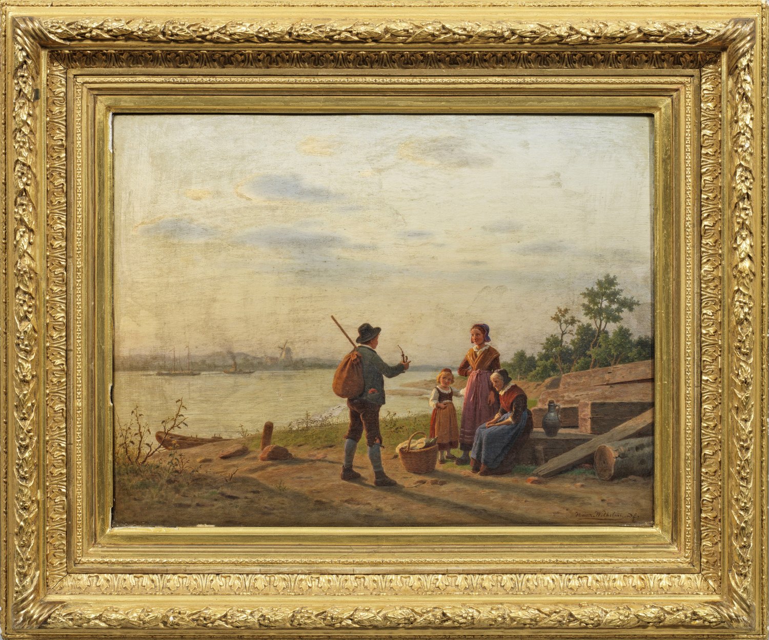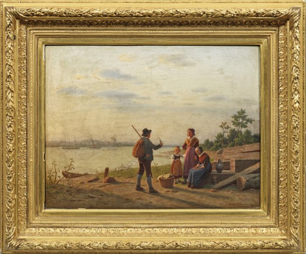 In abendlicher Stimmung eine rastende Gesellschaft aus Mutter, Tochter und Großmutter sowie ein Wanderer. Im Hintergrund ein Gewässer mit einem Segel- und einem Dampfschiff, auf der gegenüberliegenden Seite erstreckt sich eine Landschaft mit Windmühle. Wir blicken historisch in eine Zeit des Umbruchs, in der Segel- und Dampfschiffe sich begegnen. Wilhelmi, der an der Düsseldorfer Kunstakademie studierte und 1859 bis 1889 Mitglied des Künstlervereins Malkasten war, schildert in seinen Genre-Szenen gern ein friedvolles Familienglück. Das für die Düsseldorfer Malerschule typische weiche Licht, dürfte auch von seinen Studienreisen nach Italien inspiriert sein. Öl/Lwd.; R. u. sign.; 37 cm x 49 cm. Rahmen.