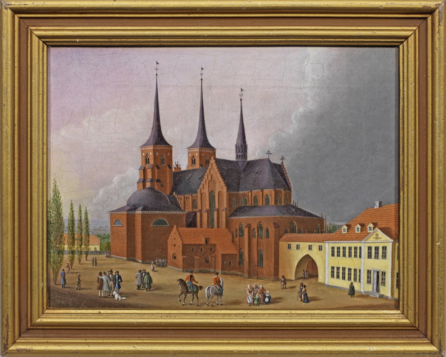 Feinmalerisch ausgeführte, biedermeierliche Ansicht, die durch kleinfigurige Staffage belebt wird. Schultz studierte an der Danziger Akademie bei Johann Adam Breysig und ab 1820 an der Akademie in Berlin bei Johann Erdmann Hummel. Schließlich ging er 1823 nach München, um sich durch Lorenzo Quaglio zum Architekturmaler ausbilden zu lassen. 1824 reiste er nach Italien und blieb dort bis 1828. Danach ließ er sich in Berlin nieder und wurde 1832 zum Leiter der Danziger Kunstschule als Nachfolger Breysigs ernannt. Öl/Lwd.; L. u. sig. u. dat. 1841. Verso alte dänische Bez., wohl aus der Zeit. 20,5 cm x 27,5 cmRahmen.