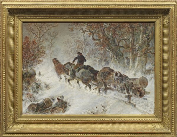 Das wohl um 1860 entstandene Gemälde ist in künstlerischer Qualität, Motiv und Stil repräsentativ für Kauffmanns Oeuvre. Geschildert wird ein von zwei Pferden gezogenes, schwer mit einem Baumstamm beladenes Fuhrwerk bei Schneegestöber durch einen norddeutschen Eichenwald, aus dem zwei Holzfäller hinzutreten. Die Schwerstarbeit des Ziehens erhält in Gestalt der unwirklichen Natur und des Schneetreibens eine dramatische Steigerung. Zu Kauffmanns Haupsujets zählten ab 1848/50 realistische Winterlandschaften mit Fuhrwerken, die sich durch ihre subtile, genau beobachtete Wiedergabe sowohl der Szenen als auch der Landschaft, der Natur und Schneestimmung auszeichnen. Aus dieser Werkreihe stammt auch das bekannte Gemälde "Holzfuhre im Schnee" von 1858 in der Hamburger Kunsthalle. Öl/Lwd.; L. u. sign.; 47,5 cm x 67,5 cm. Rahmen.