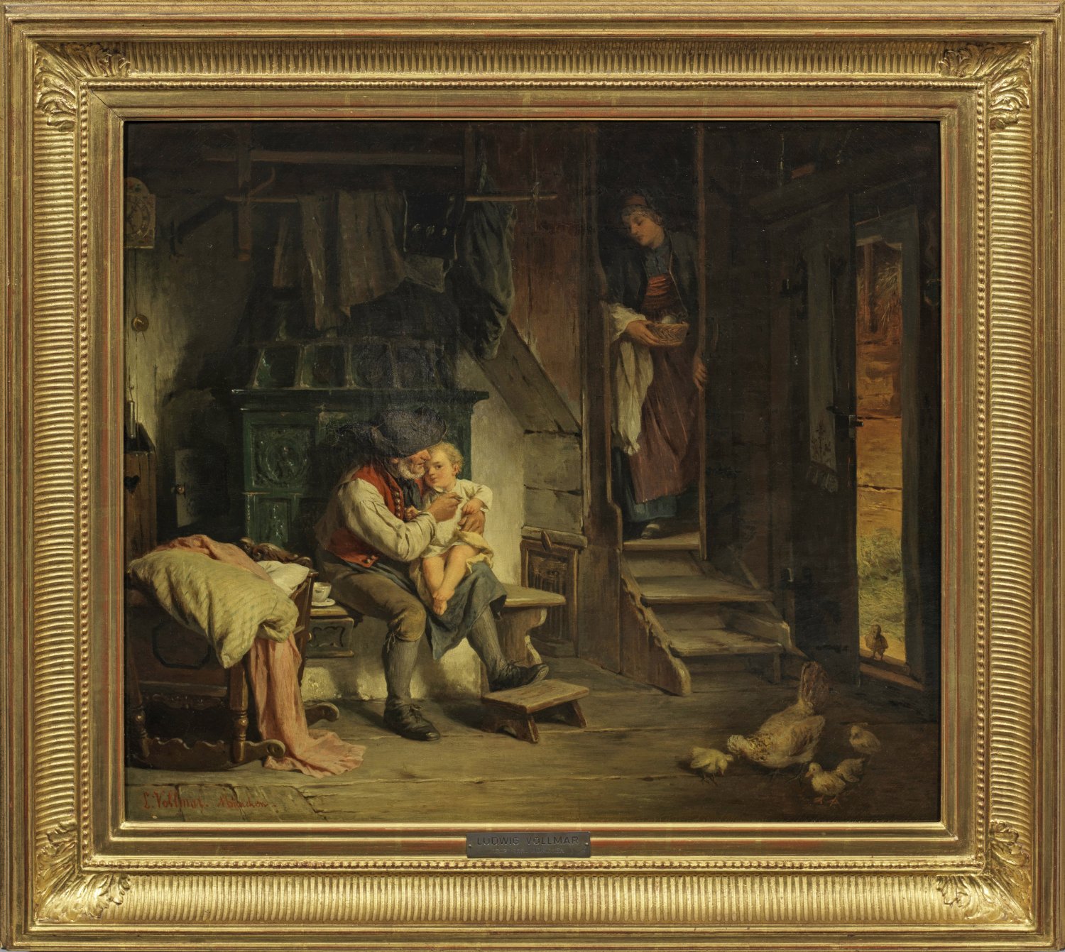 In der Stube eines oberbayerischen Bergbauernhofes am Ofen sitzender Großvater, das auf dem Schoß sitzende Enkelkind mit einem Löffel fütternd. Im Hintergrund die Mutter, den Raum über eine Treppe betretend. Sehr stimmungsvolle Darstellung mit feinem Pinselduktus in nuancenreichem Kolorit, meisterhaft in der Wiedergabe des Stofflichen und der Lichteffekte. Charakteristische Genreszene des bedeutenden Münchener Malers. Vollmar studierte 1858 - 1870 an der Akademie in München bei Hiltensberger, Phil. Foltz und A. von Ramberg. Öl /Lwd.; L. u. sign., doubliert, ortsbezeichnet. Minim. rest. 58 cm x 67 cm. Rahmen.