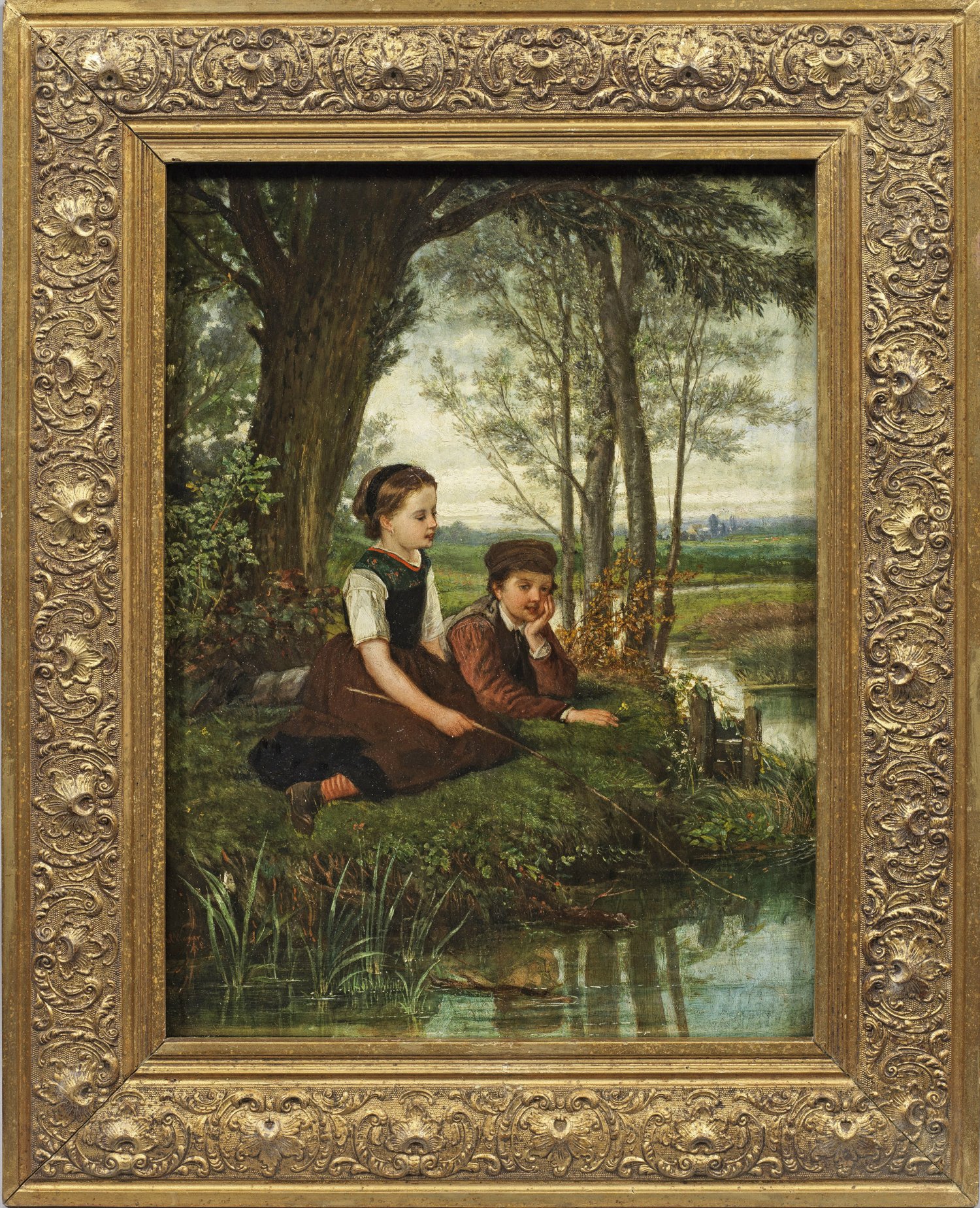 Stimmungsvolle, ländliche Genreszene. In einem weiten Landschaftsidyll, am Ufer eines kleines Baches im Schatten belaubter Bäume sitzend zwei Kinder, verträumt in die Weite bzw. in das Gewässer blickend. Nach einem ersten Studium an der Berliner Akademie ging Wagner 1852 zu Nicaise de Keyser an die Akademie in Antwerpen, wo er sich dauerhaft niederließ. Mit seinen Genrebildern, besonders den Kindermotiven, konnte Wagner nicht nur bei den Berliner Akademie-Ausstellungen, sondern auch auf anderen Ausstellungen in Deutschland, Europa und in den USA sowie auf der Weltausstellung 1873 in Wien große Erfolge feiern. Öl/Mahagonitafel. L. u. sign.; 49 cm x 37,5 cm. Rahmen.