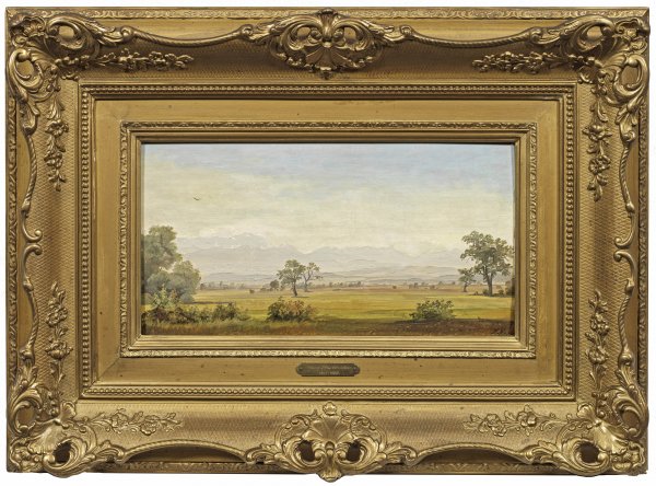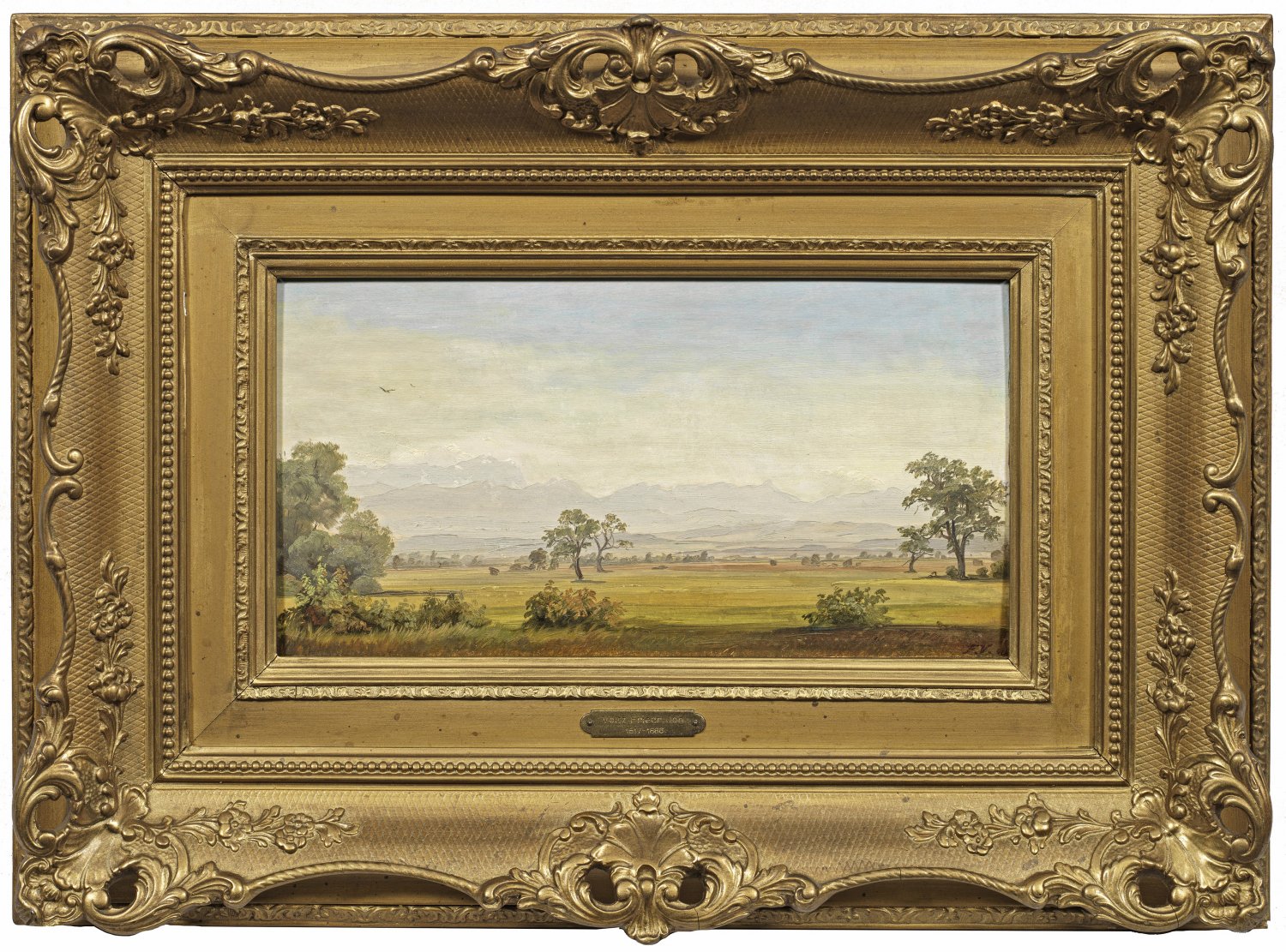 Mit weich pastosem Strich gemaltes Werk des Künstlers, der seine erste Ausbildung bei seinem Vater J. M. Voltz erhielt und anschließend die Münchener Akademie besuchte. Nachhaltig beeindruckten ihn in Holland, Wien und Paris die Gemälde mit Tierstaffagen B. C. Koekkoeks und C. Troyons. Wie dieses Gemälde zeigen seine Kompositionen meist ein gestrecktes Breitformat, Öl/Karton. R. u. monogr. FV, verso gestempelt "Aus dem Nachlass des F. Voltz". 19 cm x 35,5 cm. Rahmen.