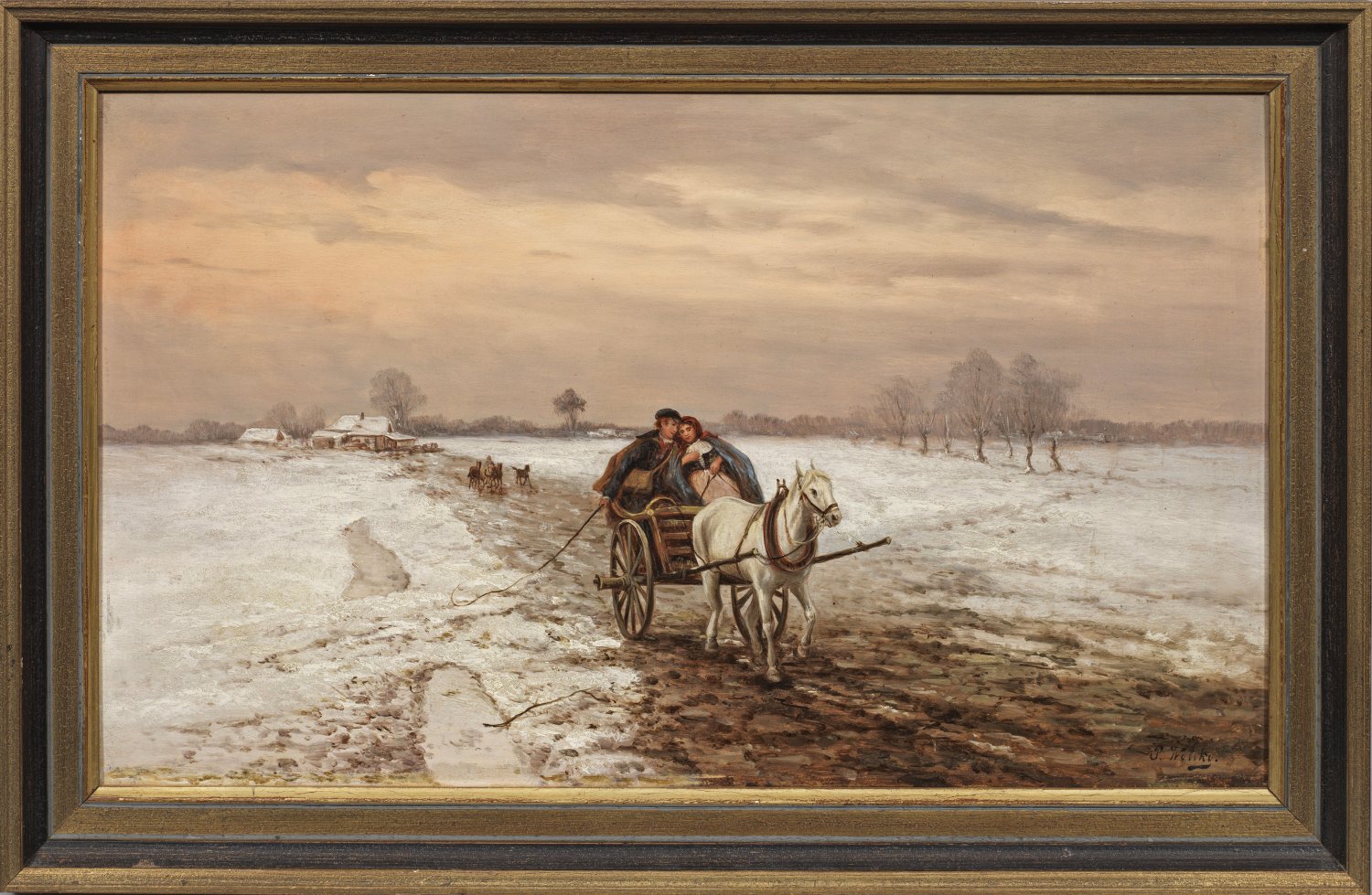 In sehr fein lasierender Malerei ausgeführtes, atmosphärisch gestimmtes Werk. Das Oeuvre des polnischen Malers umfasst insbesondere Reiter- und Pferdemotive, Gespanne und Schlitten sowie Szenen aus den Napoleonischen Kriegen. Wolski studierte an der Akademie in Warschau bei Wojciech Gerson und in Krakau bei Jan Matejko. Bei einem weiteren Studium in München dürfte er auch die Werke der dort tätigen polnischen Maler Józef Brandt und Alfred von Wierusz-Kowalski kennengelernt haben. Werke Wolskis befinden sich u. a. im Nationalmuseum in Warschau. Öl/Holztafel. R. u. sign. "P. Wolsky.". Verso altes Etikett mit deutscher Betitelung "Postbote in Polen". 31 cm x 52,5 cm. Rahmen.