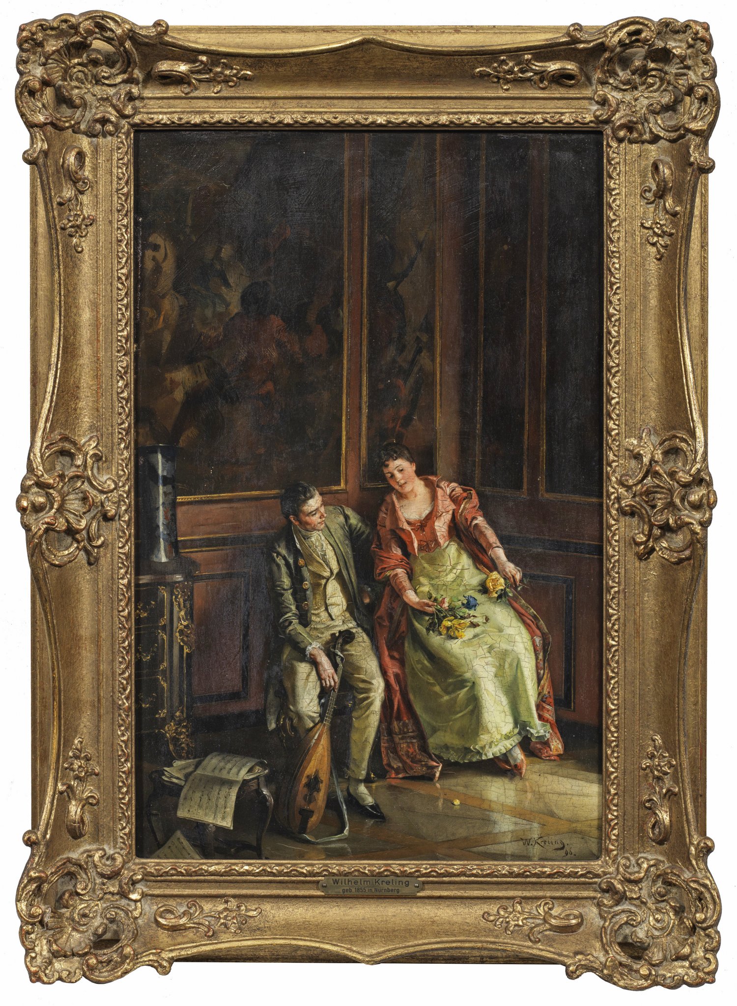 In Lichtstimmung, Stofflichkeit und Kolorit virtuos gemaltes Genrebild Krelings, der an der Münchener Akademie bei Alexander von Wagner und Wilhelm von Lindenschmit studierte. Während sich eine Reihe von Werken des von Prinzregent Luitpold geförderten Künstlers in öffentlichen Sammlungen befinden, werden Gemälde nur selten auf dem Kunstmarkt angeboten. Öl/Mahagonitafel. R. u. sign. u. dat. (18)96; Verso Original-Etiketten der Berliner Kunstausstellung 1897. 42 cm x 27,5 cm. Rahmen.