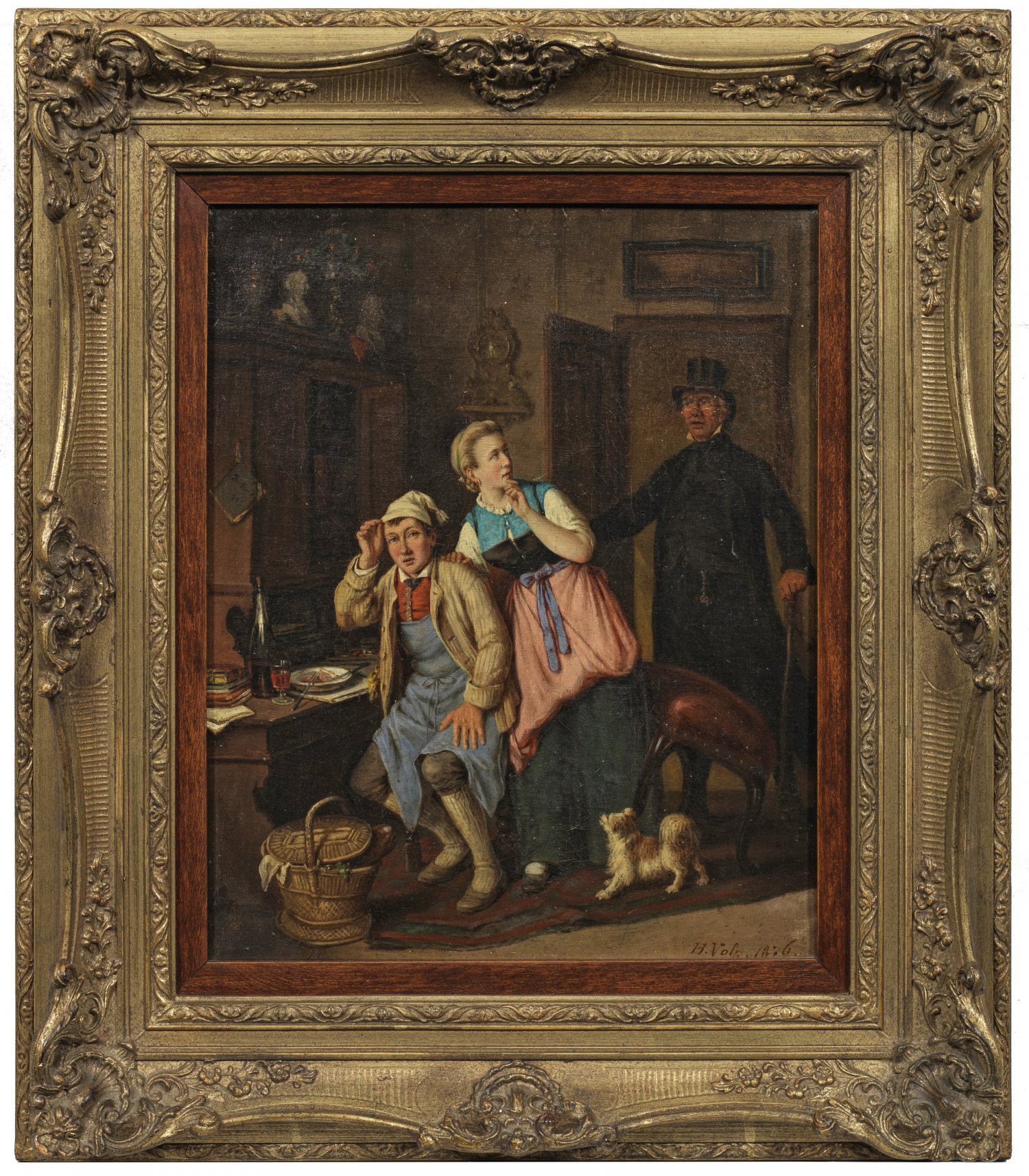 Darstellung eines jungen, vertrauten Paares in der Stube, das von einem eintretenden älteren Herren in der Tür ertappt wird. Zu den favorisierten Motiven des Genremalers, der 1841 - 1846 an der Münchener Akademie studierte, gehörten anekdotische und humorvolle, erzählerische Szenen, wobei er mehrfach das auf diesem Gemälde geschilderte Tändelei-Motiv variierte. Öl/Lwd.; R. u. sign. u. dat. 1876. 36,5 cm x 30,5 cm. Rahmen.