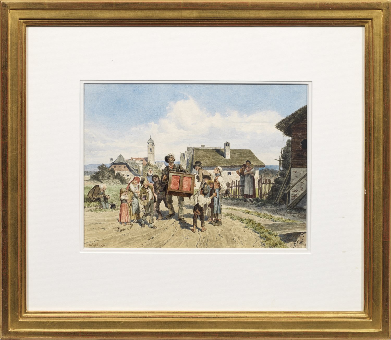 Fein zeichnerische, vielfigurige für den Künstler charakteristische Darstellung, einen Drehorgelspieler auf einer Dorfstraße darstellend, der umringt wird von Schulkindern, die offen ihre Faszination gegenüber dem fremden Mann zeigen. Die Genrestücke von Alois Greil zeigen oft ein Idyll, welches allerdings nicht ganz ungetrübt bleibt und denen er häufig einen moralischen Hinweis beifügt, wie hier der unbeachtet gebliebene Bettler am Wegesrand. Greil, dessen erste künstlerische Leistungen Adalbert Stifters Interesse weckten, konnte mit Hilfe des Dichters in Wien studieren. In seiner späten Schaffensphase wrid der Einfluss von Mortiz von Schwind und Carl Spitzweg spürbar. Aquarell/Papier. L. u. sign. u. dat. (1)872. 22 cm x 30 cm. Rahmen.