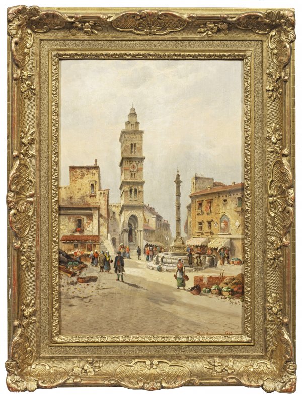 Morgendlich gestimmte, durch reiche Staffage belebte Szenerie vor dem Campanile des Doms in der süditialienischen Stadt. Der an der Wiener Akademie ausgebildete, schaffensreiche Künstler unternahm öfters Studienreisen durch Italien bis nach Neapel, wo er die Motive für seine zahlreichen Landschaften und Veduten fand. Öl/Holztafel. R. u. sign. u. dat. 1897. 47,5 cm x 30,5 cm. Rahmen.