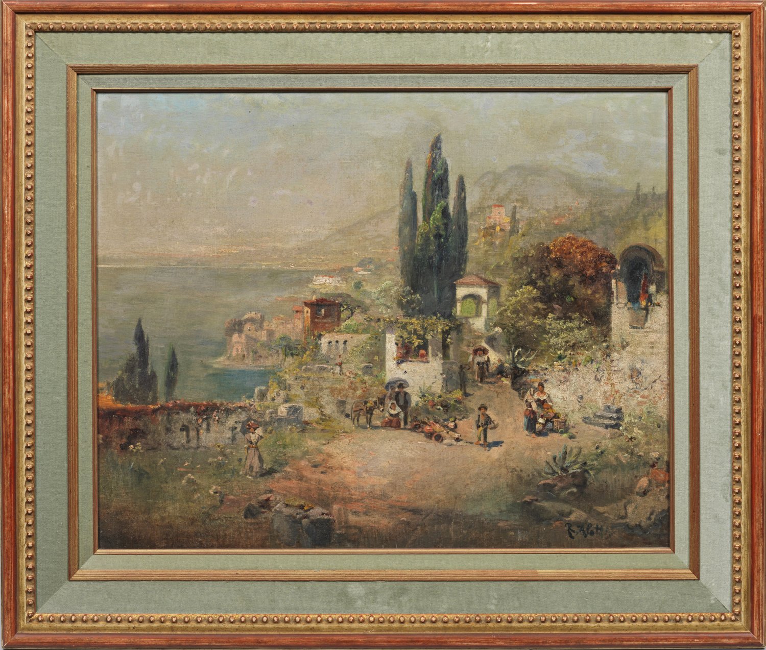Impressive, virtuos locker gemalte Landschaft mit pittoresken Gebäuden und lebendig geschilderter Figurenstaffage. Äußerst stimmungsvolles, motiv- und stiltypisches Werk des bekannten österreichischen Malers, der viele Länder der Mittelmeerküste bereiste. Alott schuf zahlreiche durch ihr Lokalkolorit und ihre besondere Atmosphäre überzeugende Italien-Veduten. Öl/Lwd., doubl.; R. u. sign.; 63 cm x 79 cm. Rahmen.