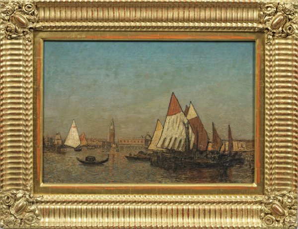 Blick von der Lagune mit Fischerbooten und Gondeln auf die Stadt mit dem Dogenpalast und dem Campanile di San Marco. Impressionistische Landschaftsvedute des vielseitigen Malers, der 1870 - 1874 an der Kunstschule in Weimar bei Theodor Hagen studierte. Berninger bereiste Italien, Nordafrika und den Vorderen Orient. Die hiernach geschaffenen Werke bestechen durch die wiedergegebenen atmosphärischen Stimmungen und Darstellungen des Volkslebens. Öl/Lwd.; R. u. sign.; 38 cm x 57 cm. Rahmen.